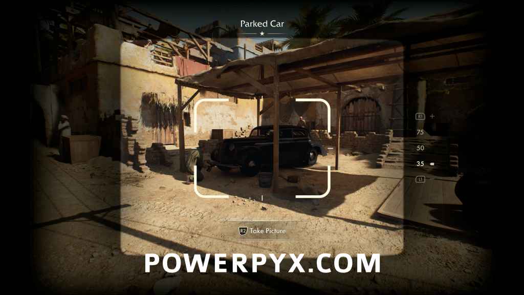 Go west of the fast travel signpost to see a parked car under a canopy and take a photo.