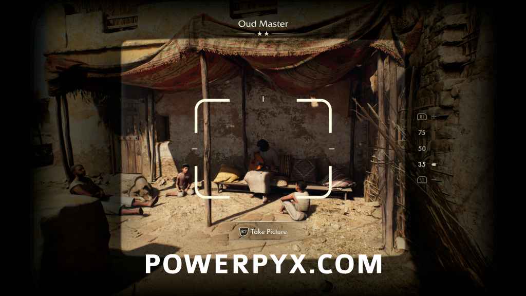 Head west down the stairs and then go west until you see a man playing the Oud, then take a photo of him.