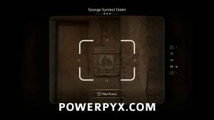 At the end of the hall you’ll find the missing piece of the tablet in the center room. Pick up the metal rod and smash the cracked wall to the northwest. Then pick up the tablet and take the tablet piece to the other half and put it together on the wall. Now take a photograph of the now completed tablet.