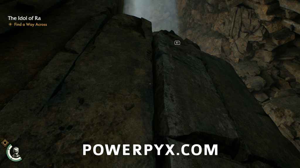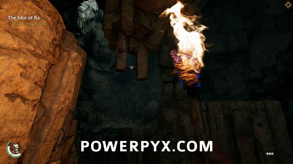 There’s one more Ancient Relic in this cavern, so don’t use the last swing point. Instead look to the southwest. There’s a narrow gap here that you can jump across to reach what’s left of the bridge out in the middle of the cave.