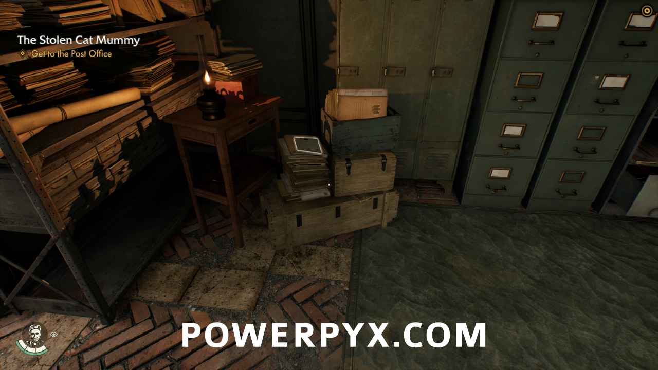 Inside an office in the southeast corner of the Castel, on top of a crate.