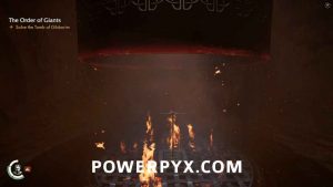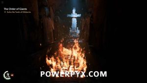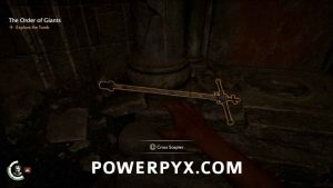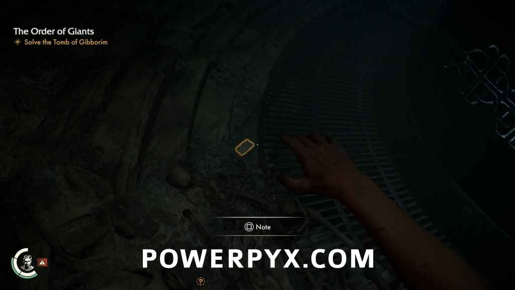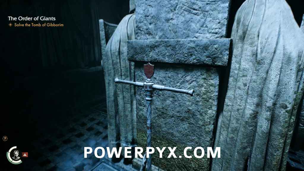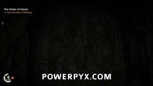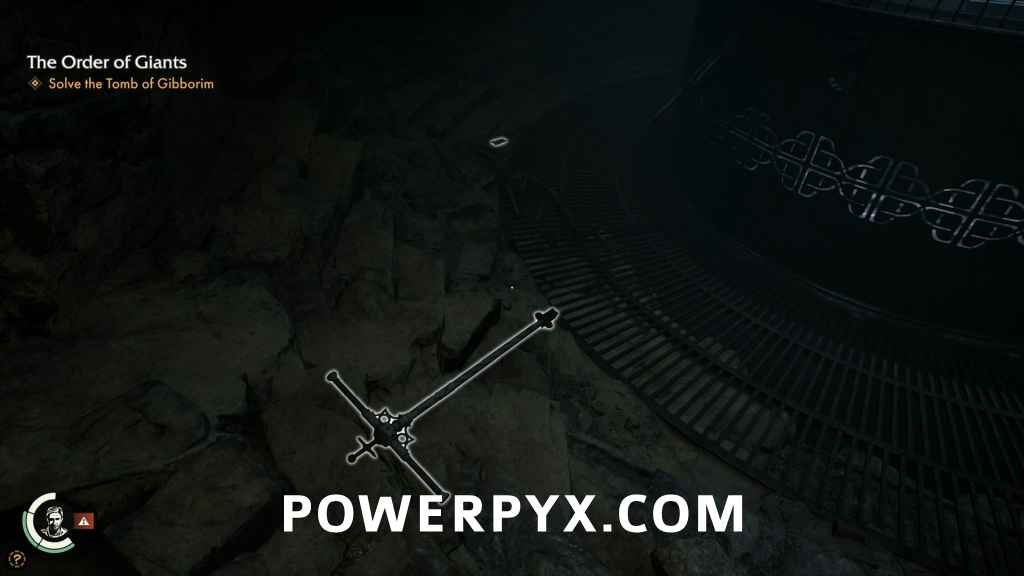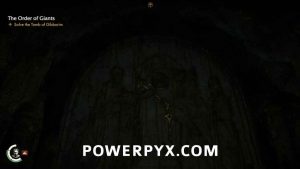 Keep going past the tree to find an alcove that has a narrow passage you can squeeze through, and on the other side you’ll find the Tomb of Gibborim. You’ll enter along a balcony high above the room below, so go to the left until you’re right in front of the tall statue then look up to find a bar that you can whip to lower yourself down safely.