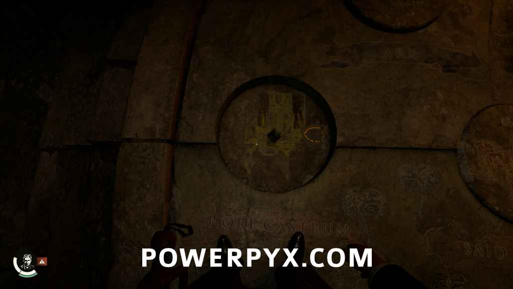 Looking at the ground, you will see that the entire platform is a map, each circle representing a different place and marked with its name. Each also has one of four symbols: a cross, a shield, a sword, and a trinity symbol. All four symbols appear on the altar in the center of the room, and also on four murals that are around the edges of the room. In the southeast corner, you’ll find a Cross Scepter, which looks and performs much like the Serpent Wrench seen earlier. Pick it up, and plant it in the hole next to the cross mural and a panel will slide away to reveal a latin inscription.