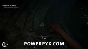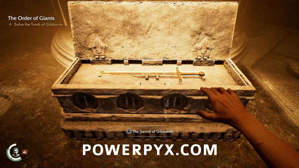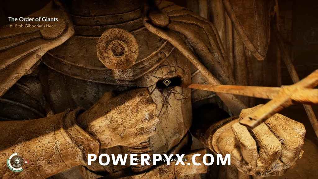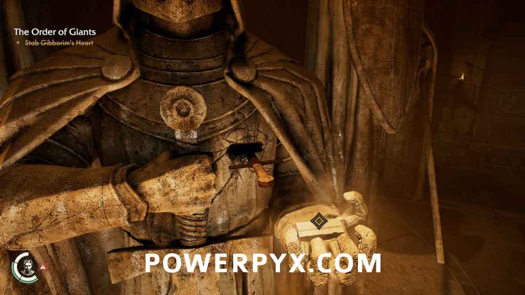 Once the statue as at your level, approach it and you’ll see an interaction prompt at a hole in its chest. Use the sword to stab Gibborim’s statue and his hand will open to reveal the third and final cylinder piece.