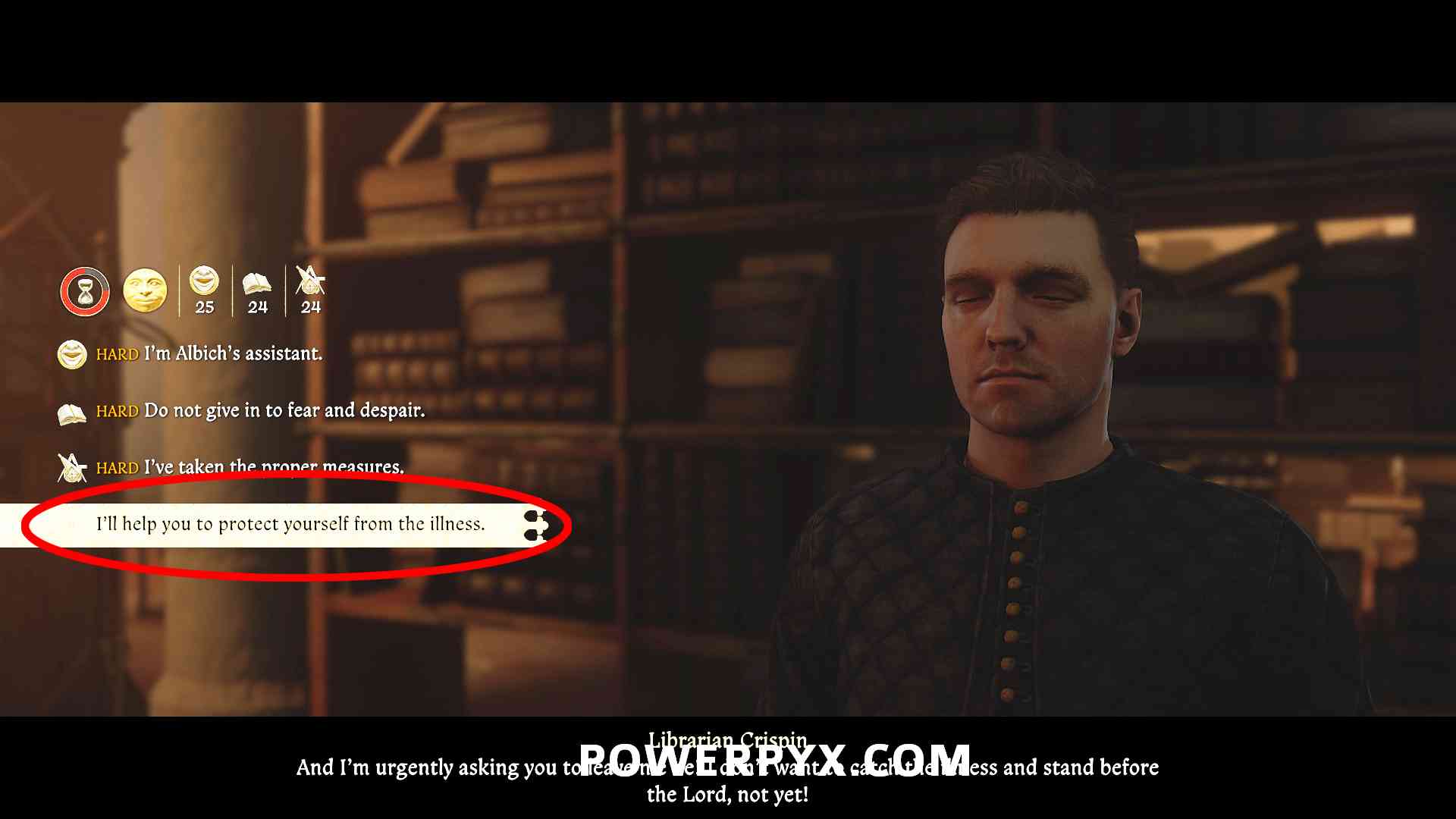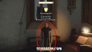 Missable Task: Foreseeing Evil – talking to Librarian Crispin and picking the non-skillcheck dialogue “I’ll help you to protect yourself from the illness” triggers another missable task Foreseeing Evil. But we’ll deal with this after the current quest is complete, for now carry on here.