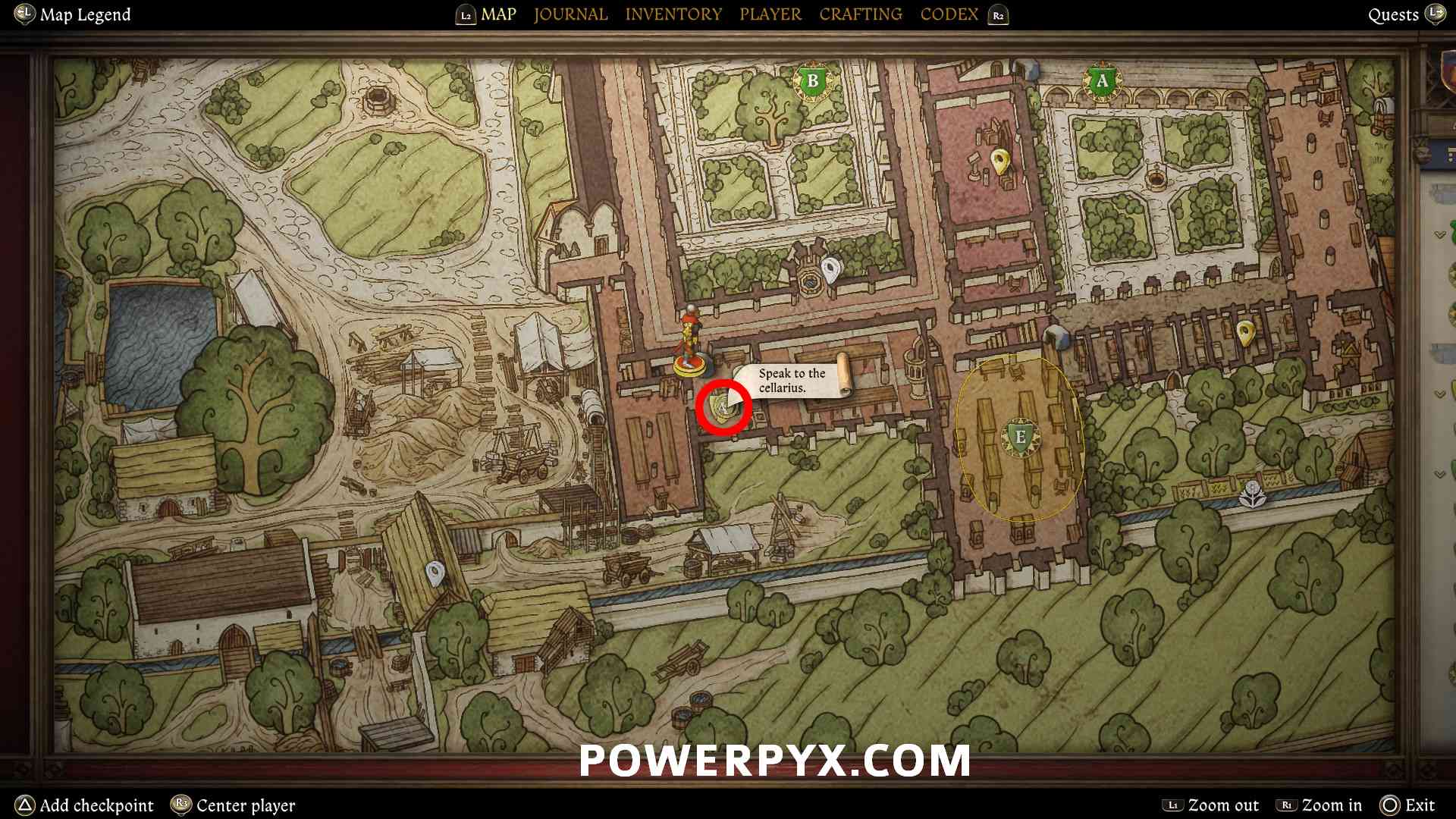 Brother Cellarius is found in the kitchen. The easiest way is to sneak southward from the infirmary, go through the courtyard, then enter the cellar next to the library. Go through the cellar and you’ll find an exit that leads into the kitchen. There are never any patrols in the cellar so it’s the safest way to get around.
