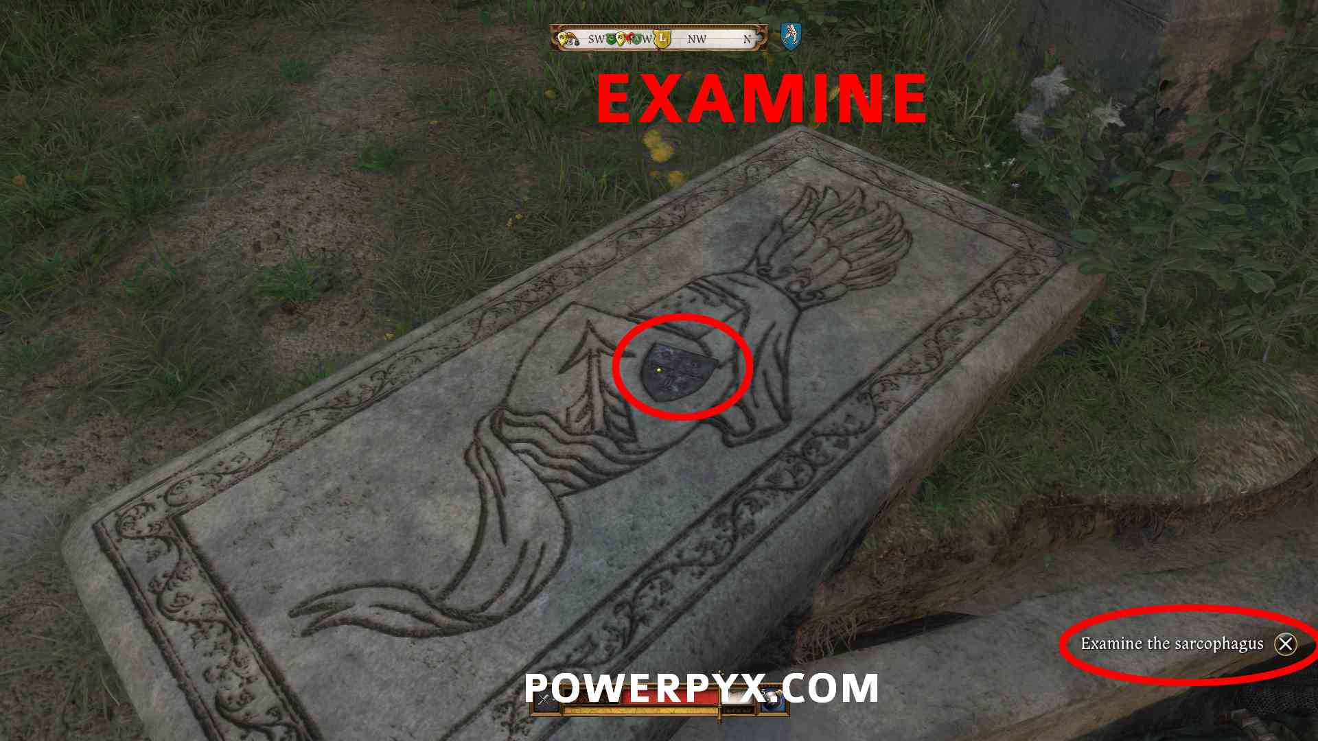 To find the relic, look at the silver cross on the sarcophagus left of the grave. The prompt “Examine the sarcophagus” will appear in the bottom right. If the prompt doesn’t appear, you must first do objective Find the mural of Boleslav Bavor for Henry to recognize the mural. Only after this you can interact with it.