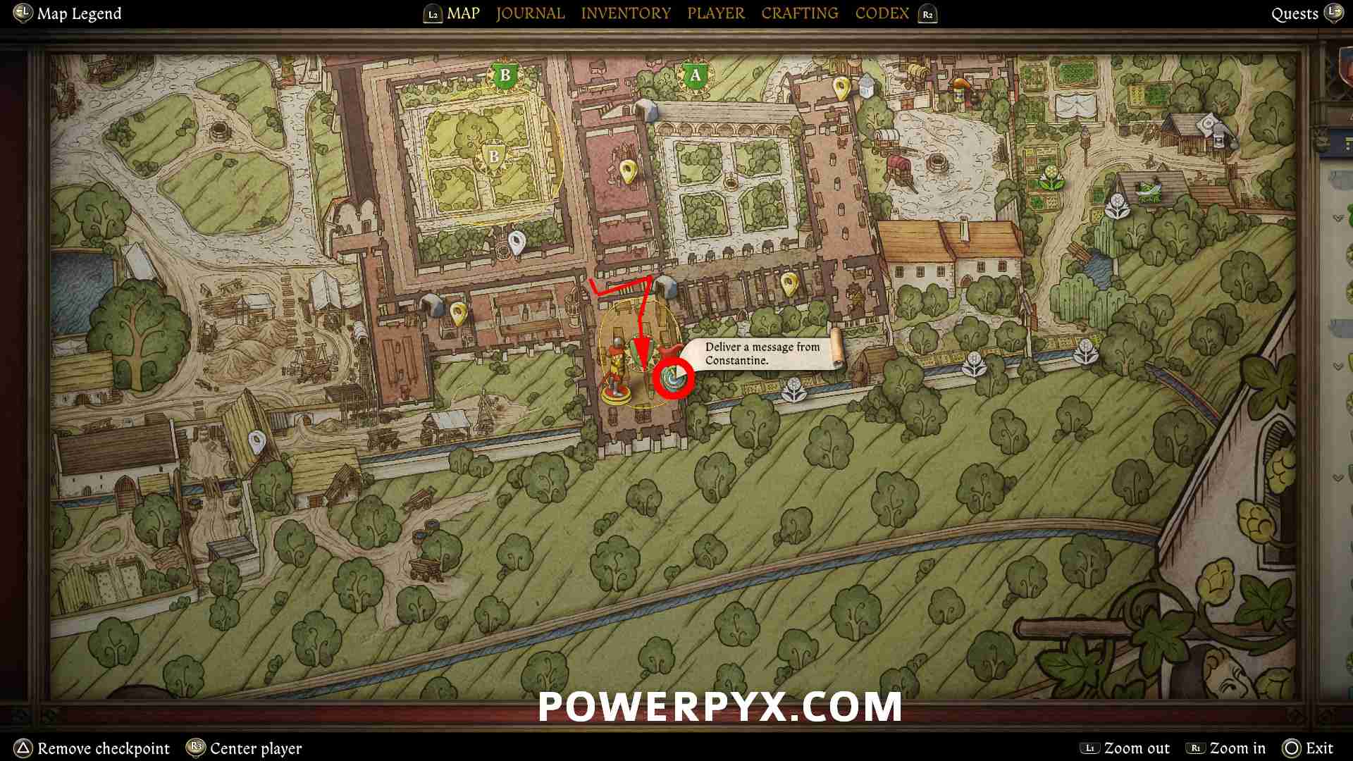 Location #2 – talk to Monk Constantine in the gardens east of the infirmary. Tell him “What are you doing in the garden?” > “Why aren’t you with the others?” > “I’ll help you deliver your message” -> this skip the first two objective, continue at 3rd objective.