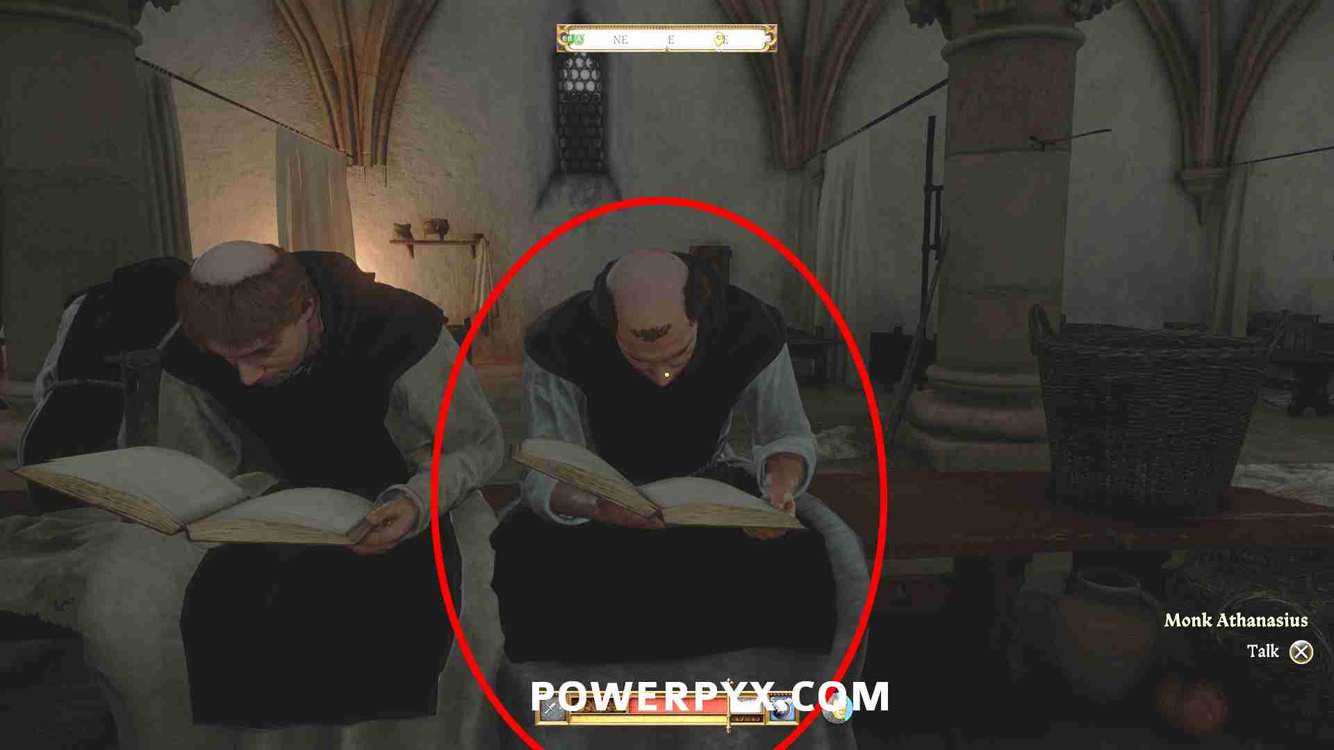 Either way, talk to Brother Athanasius on the top floor of the monastery, above the library. Go up the stairs in front of the library to reach the monk living quarters.