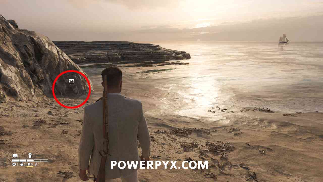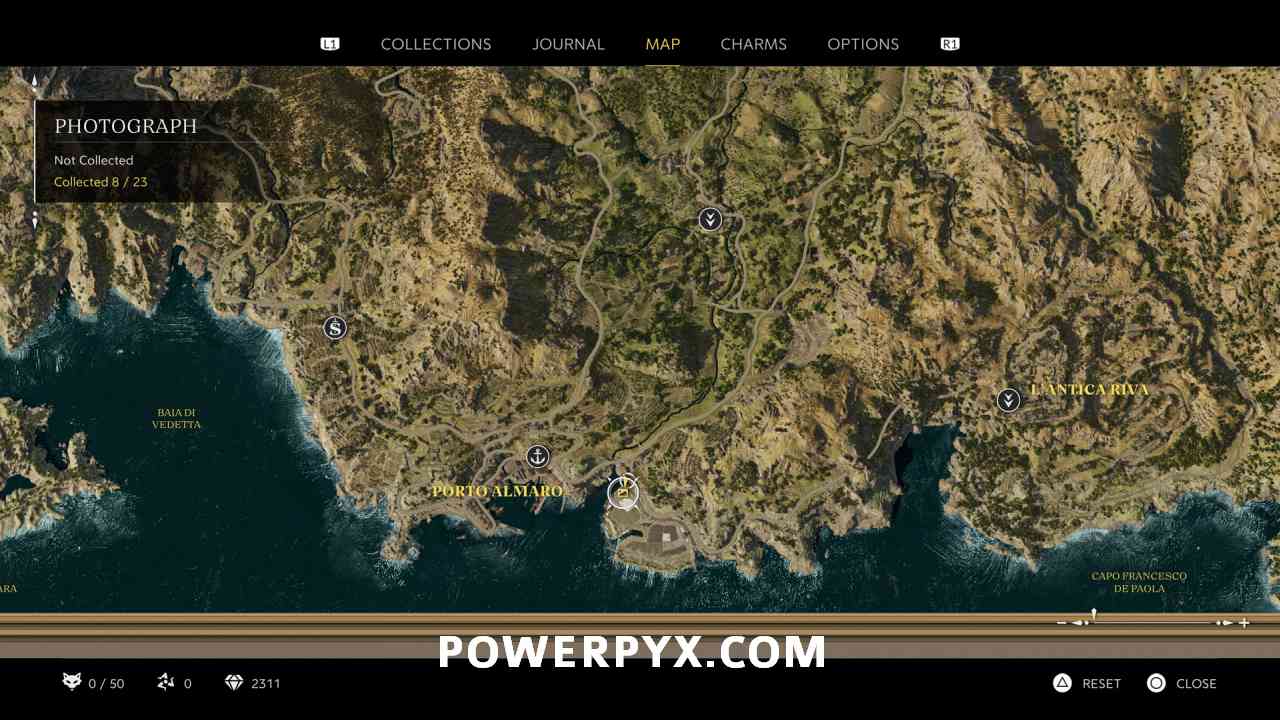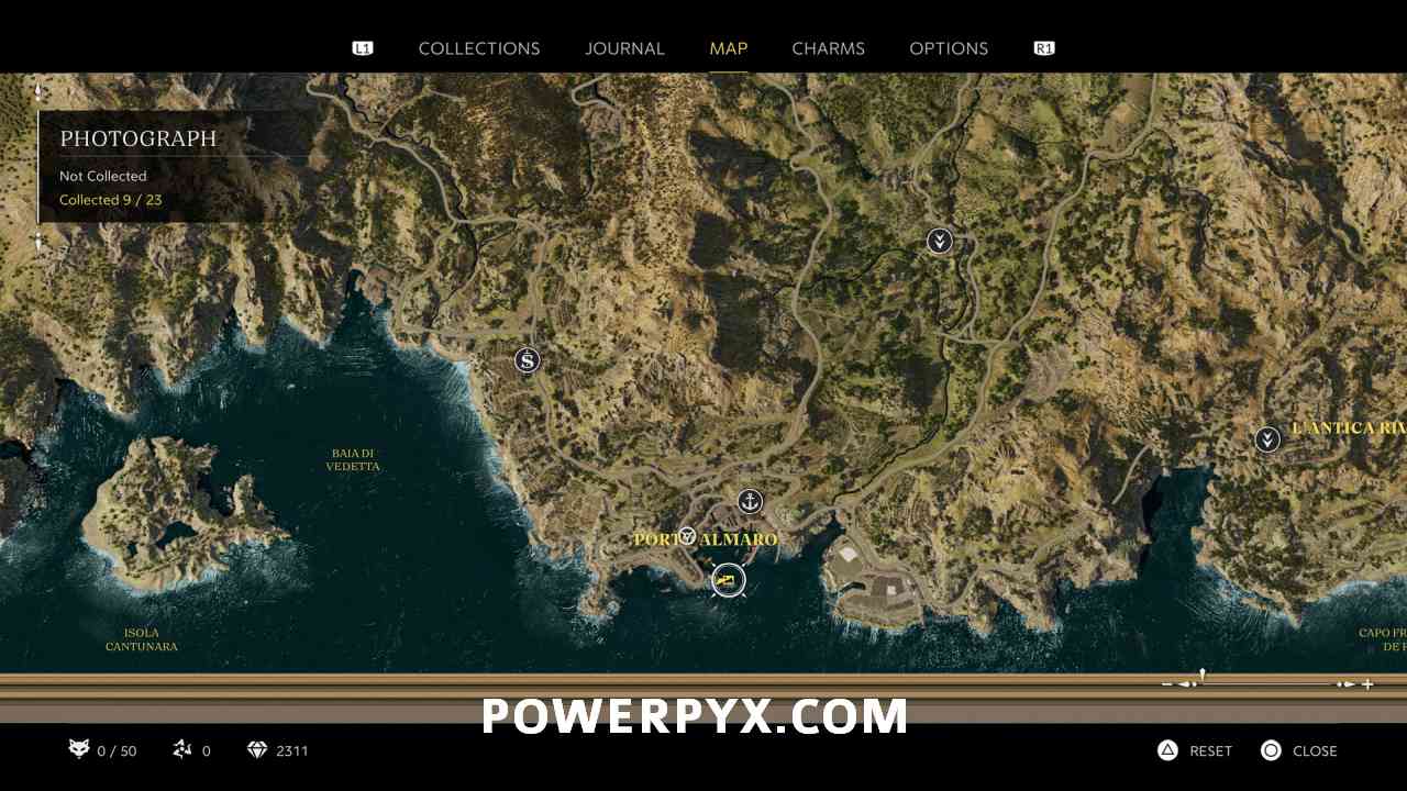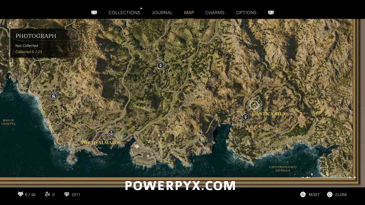 At the southern tip of a hidden beach, west of Porto Almaro. At the road between Porto Almaro and Pasquale’s Gas Station, next to a bridge you can go down some stairs to the south. This puts you on the path to the hidden beach. At the end of the beach is the photo icon.