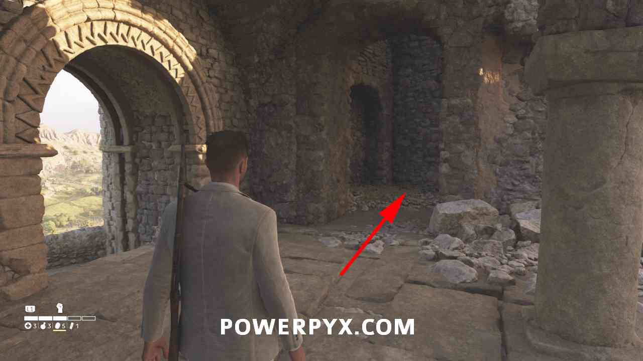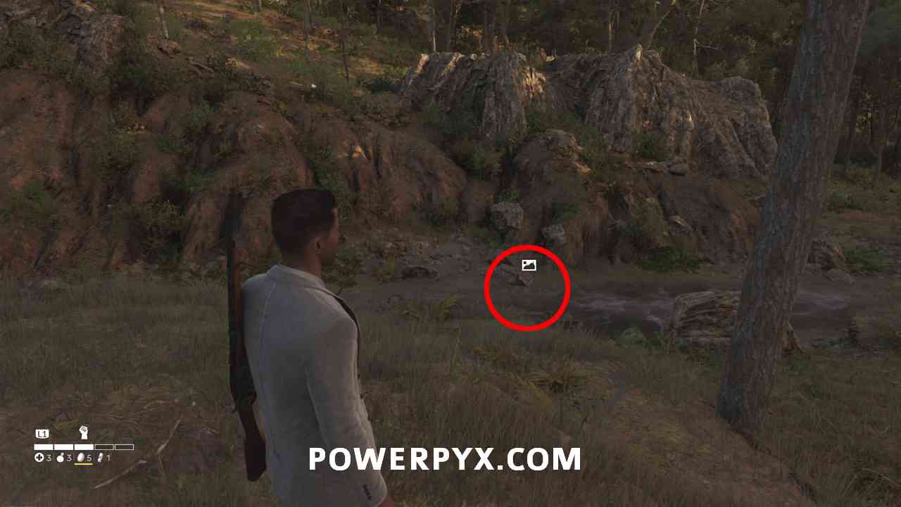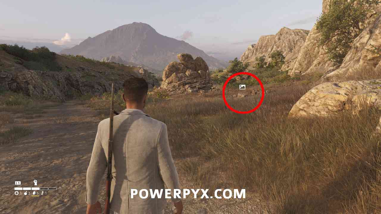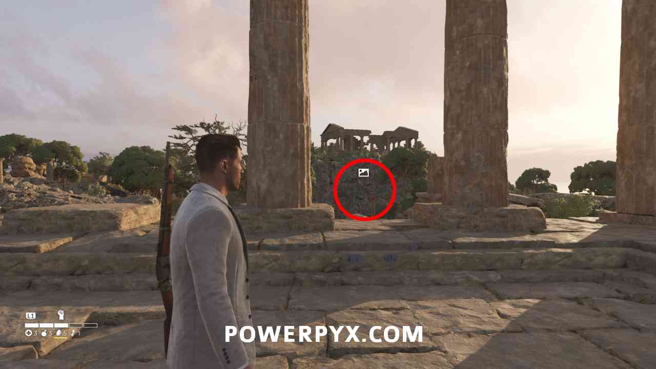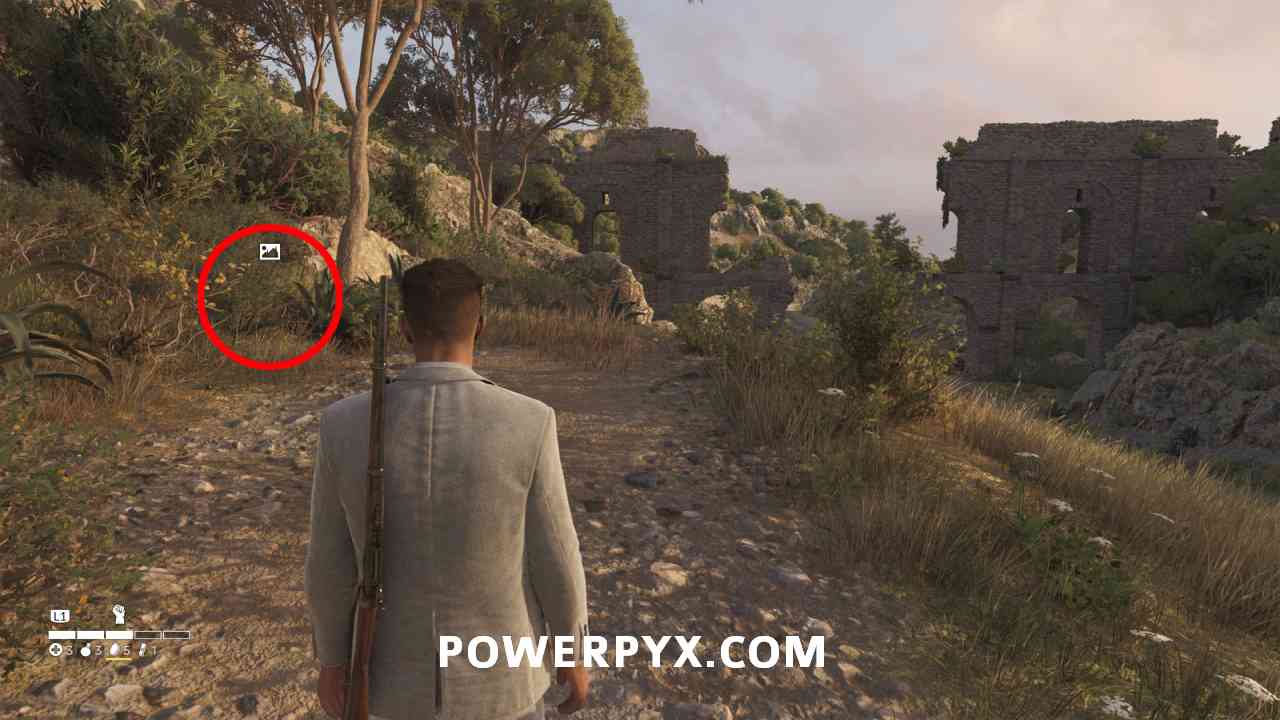 In the north-east edge of the map, along the main road there’s a small dirt road leading into ruins with this photo.