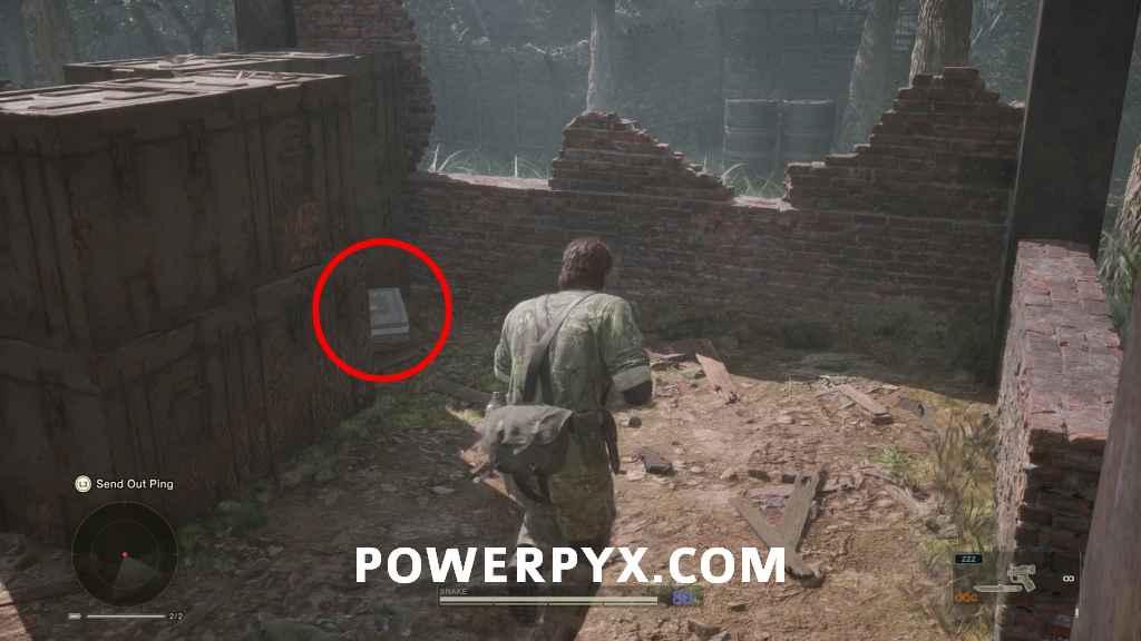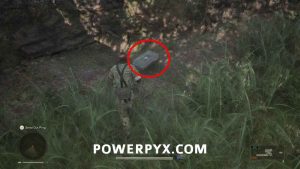 Weapon (Stun Grenade) – From where the Grenade was, go around the right side of the area through the open area with grass. Here follow the wall at the edge of the area behind a big tree stump to find this.