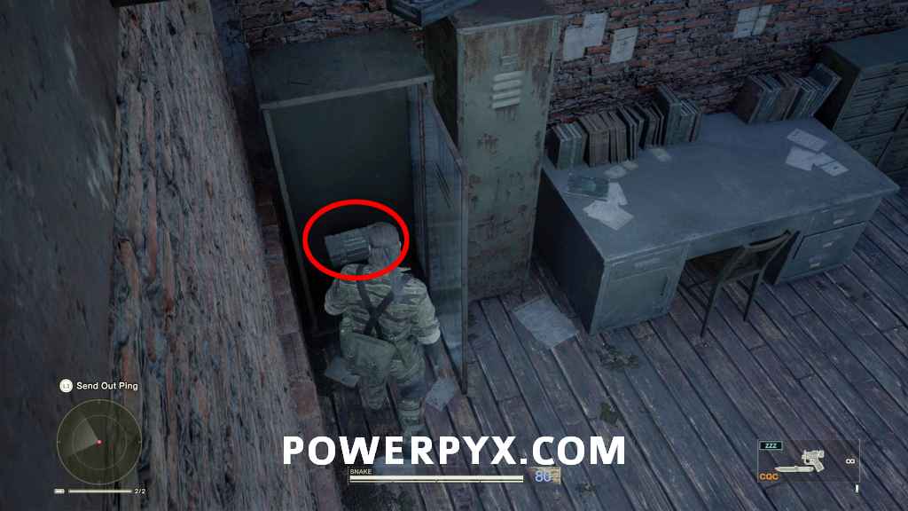 Weapon (Scorpion) – Either follow a guard through the door or equip the Officer camo and Mask to access the room. On the ground floor, in the 2nd room in the middle, in between two shelves.