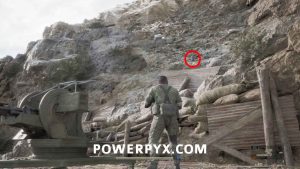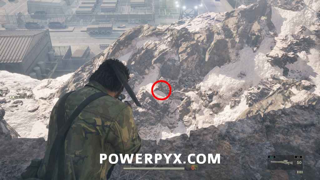 Ga-Ko #39 – This one is below you among some smaller rocks, it’s hard to see. Next to the tower with the numbers 07 there are 2 red and white cones, aim between these and start moving your aim downwards slowly, after a few seconds you should see it among a group of smaller rocks, it’s very well blended in, but you should see it at an approx 50-60 degree angle from where snake is standing on the cliff edge.