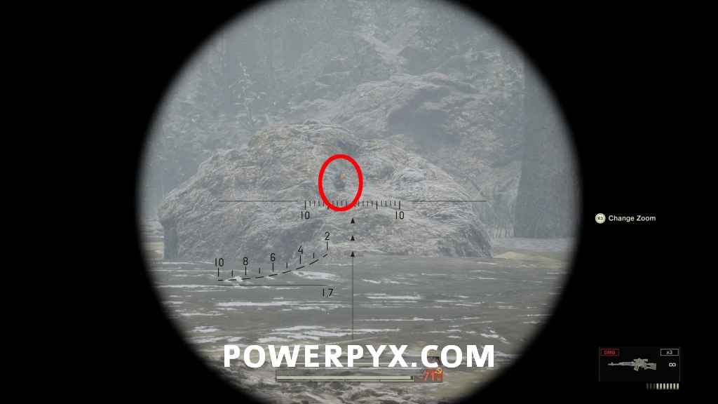 Kerotan #61 – Not long after entering the area you will see this on a rock on the left in front of the bike (left of the direction you’re driving towards, not behind you). Just when driving between two rocks on either side, about 7 seconds into this area. If you are struggling to hit it with the SVD try using the M37 shotgun when close.