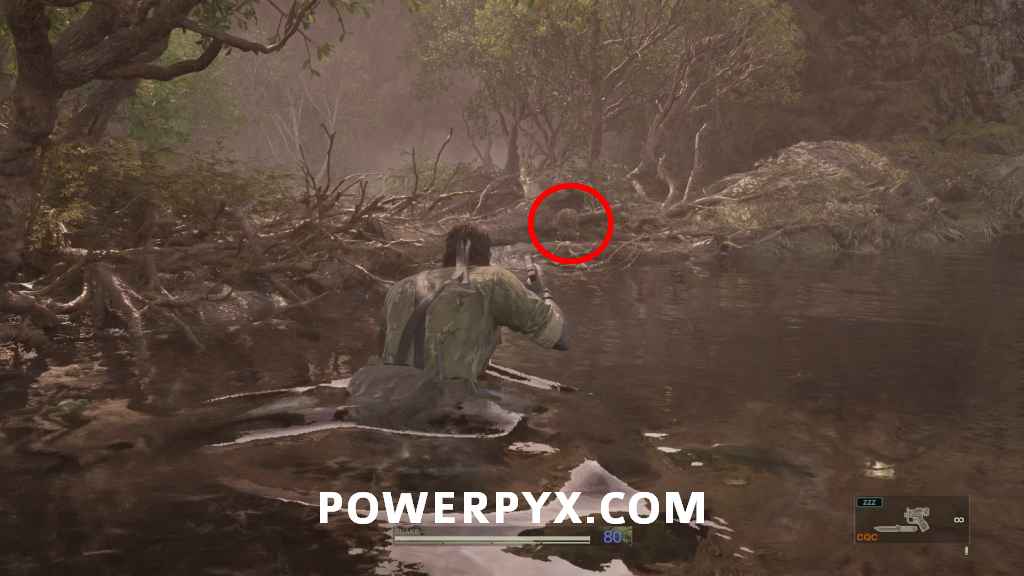 Ga-Ko #19 – Proceed further down the river, just when you come out of the trees you can find this among some fallen branches on the left above the water, just before the path splits. It’s fully camouflaged so can be a bit hard to see, look for a big gray round object on the fallen branches.