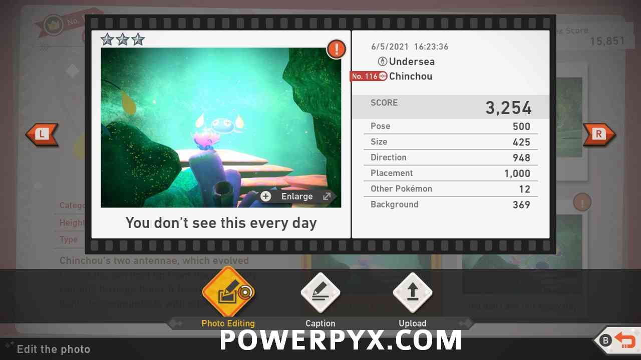 When you take the first alternate path on the ;eft at the start of the area once you start descending you will see a bunch of Chinchou gathering below before heading to their little dens. There will be one swimming into the screen from the lower left side headed towards its den on the far side of the area. Throw an illumina orb at this Chinchou and instead of heading towards its den it will head on a side path to the left toward a Crystabloom flower. The earlier you hit the Chinchou the faster the others will surround themselves around the Chinchou by the flower, once all 5 are around the flower snap this picture for the 4 star pose.