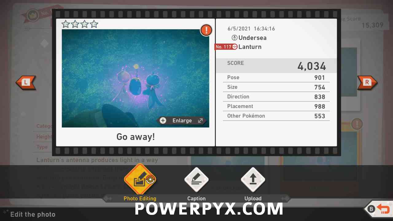 Heading down the alternate route you will get to the spot where you start descending deep into the cave before the Frillish feeding off the ground. Midway down you will see a Lanturn swimming around. Throw an illumina orb at the Lanturn and continue downward. Look behind you and you will see a couple Frillish trying to drag that Lanturn away. Throw an illumina orb at the group and the Lanturn will forcibly break away, taking a picture at the moment the Lanturn is breaking away is its 4 star pose.