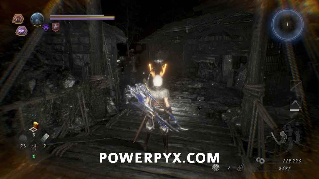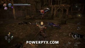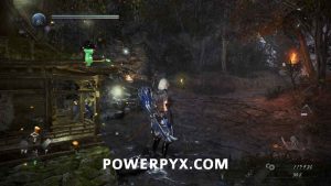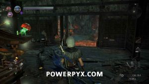Just on the right as you’re entering you can see another Yamanba sitting on the ground. For a slightly easier time in this area, go up on the rooftops and shoot any of the Gaki you see so that you don’t need to deal with them. If you look below you, you should see an Enki wandering in and out of a house, this is the enemy to kill to dispel this Darkness Realm. Drop attack it for some free damage if you can. Once it’s dealt with head between the houses, watching the first one on the right for another Yamanba inside. When it’s dead continue around the corner of the second on the right, and inside some breakable items is Kodama #4. You can head down the hill more and find a locked chest in another house which will have Ninja’s Locks in it. After you’ve been around and searched all other buildings you can head back up to the shrine to continue forward.