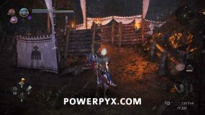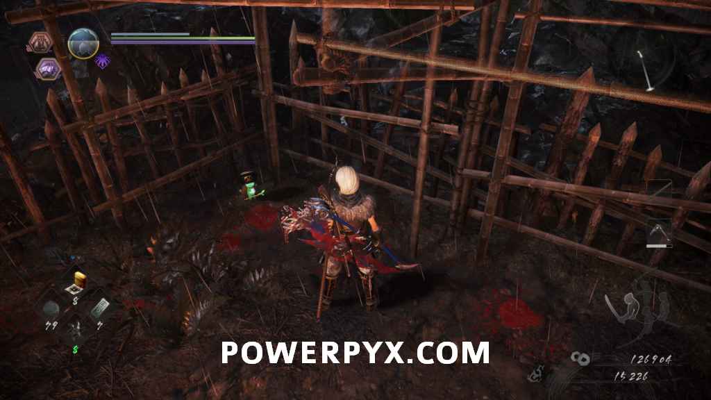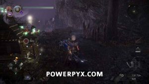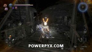 In this area first head to the right. There is one enemy in here you can kill, then also summon using the NPC Benevolent Grave if you wish. After that go all the way left, not going into the area behind the wood barriers and white flags yet as that’s the boss room. On the left there is one more enemy to kill, then under the scaffolding behind the breakable items is Kodama #7, the final one for this mission. After grabbing it you can now proceed to the boss room.