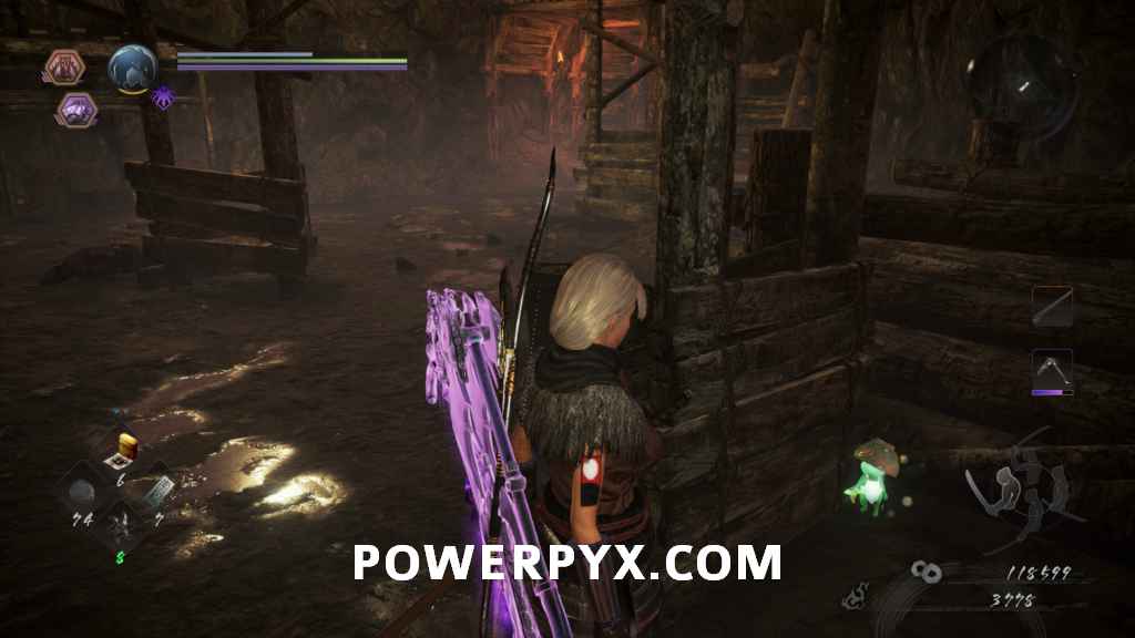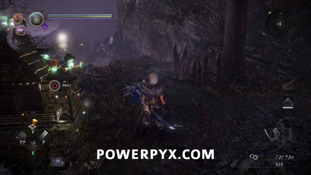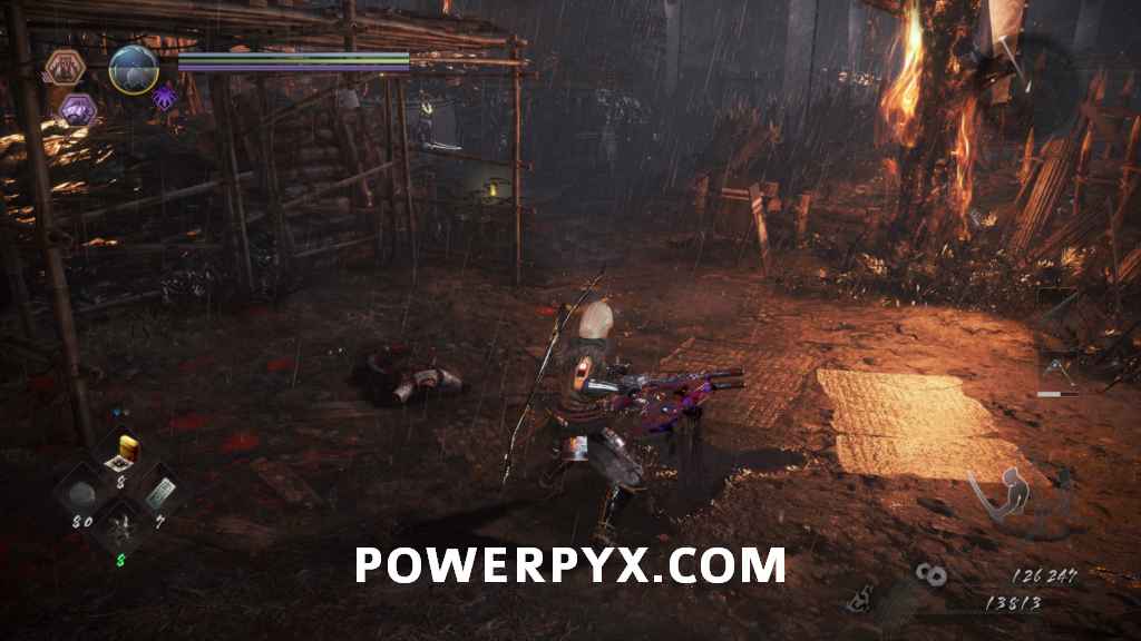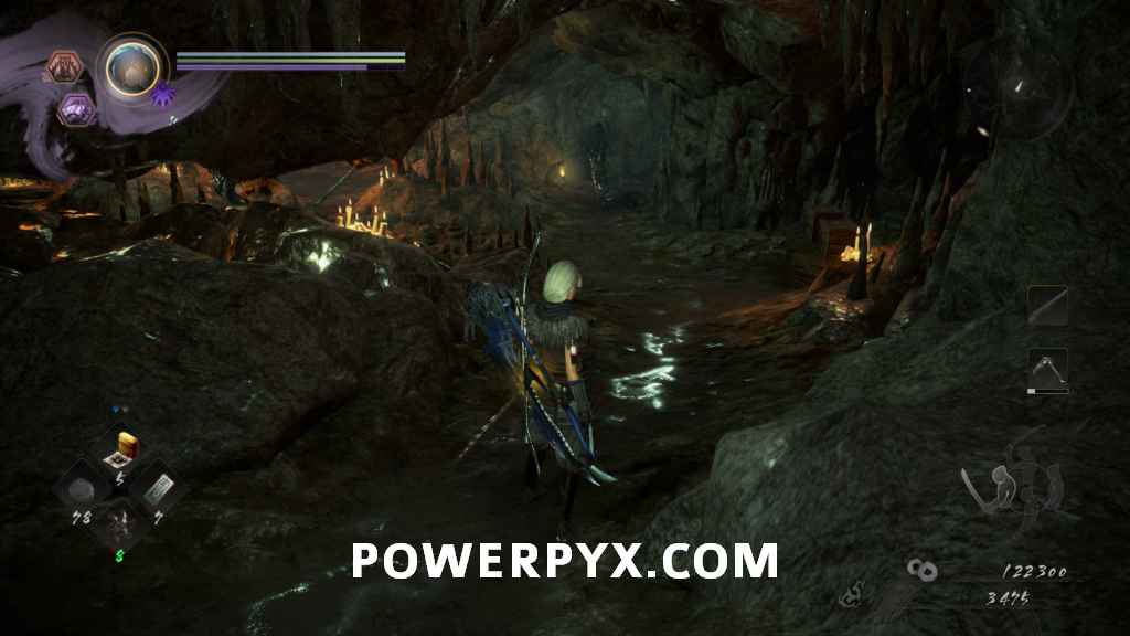 Head into the next room and you’ll see an enemy on the far side looking away from you. This will be your first encounter with a Yamanba. They wield knives and swing them wildly around at you. Their burst attack is a long move where they basically flail around while walking towards you, and then at the end throw of the knives towards you. Once it’s dead, go down the left path first. On the left of the split is the first ladder shortcut you can kick down, and on the right is a Sudama you can interact with.