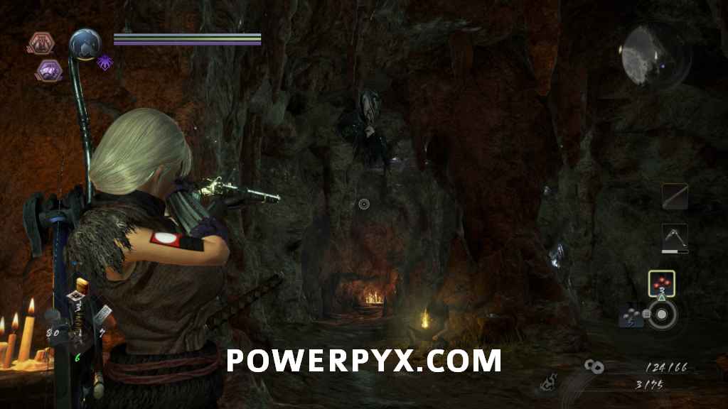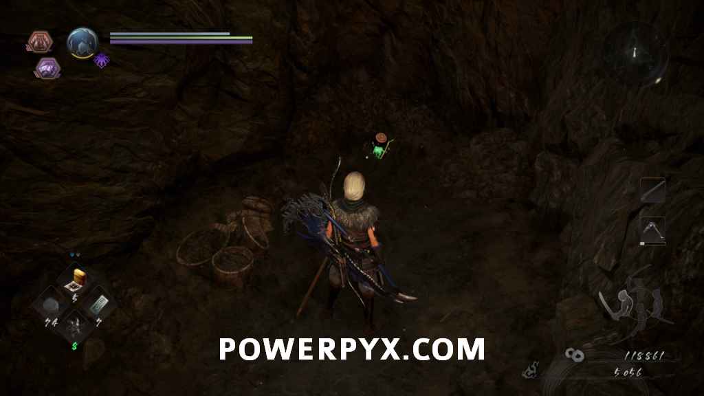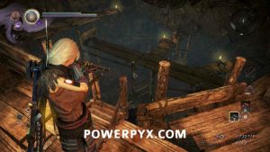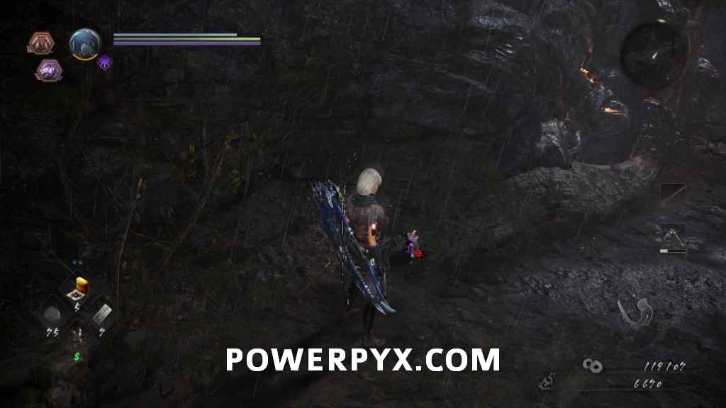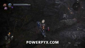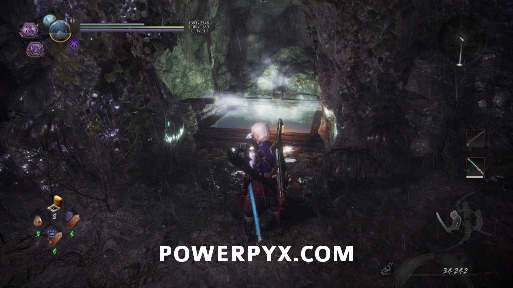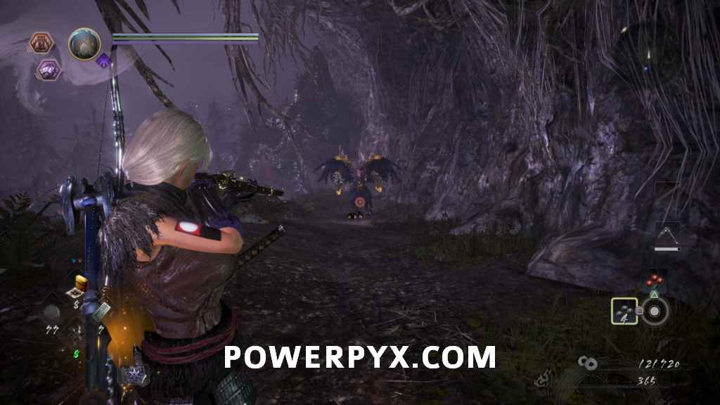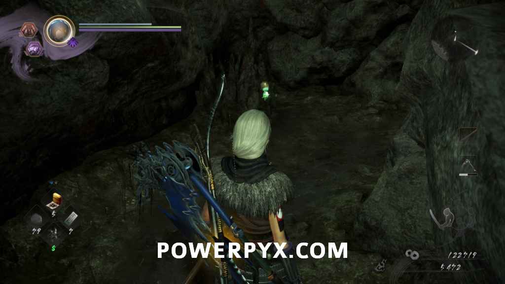 Head back through the cave and out the right path, which leads you outside again. In the first cave on the right will be another of the Yamanba Yokai, and if they charge at you from in the tunnel it’s possible for them to knock you off the ledge. In the room it was in you can find a Scampuss hiding behind some barrels, then continue along the outside of the cliff. Be careful going around the corner as there is a Yokai Fog that spawns an Enki, and you don’t have a lot of room to fight it around this corner. If you head left across the bridge you will go into a Darkness Realm area which is where you go to progress, so keep heading up the cliff first.
