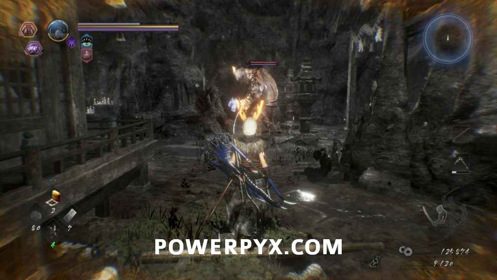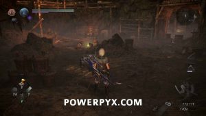 The top path out of the circular room will have a Yokai Fog that spawns a Yamanba. Further in you will see a body with an item, watch out because just about it is a Nure-Onna hanging from the ceiling. If you continue forward you will get to the Darkness Realm you might have stopped out on the outside part of the cliff. Inside there will be the large One-Eyed Oni, an Oni-bi, and a Gaki. If you didn’t do a prior side mission this will be your first encounter with a One-Eyed Oni. They swing around with their arms and try to grab you. They are typically fairly slow, so you can somewhat use the environment in here to mess with their AI by making it walk around things to get to you. When it charges its Burst Attack it will spin in a circle swinging its fists two times while moving towards you.