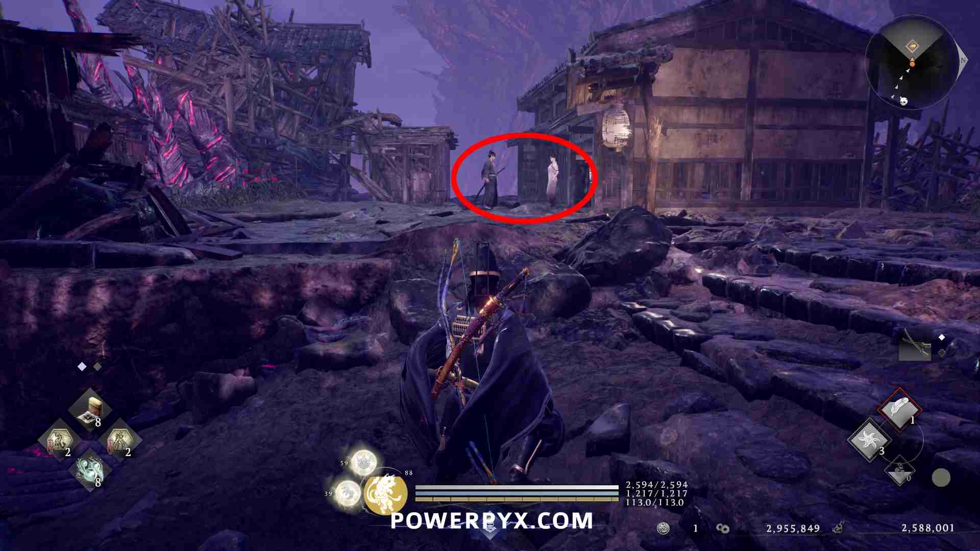 Sanjo: approach the quest marker to start (only reachable after clearing the Crucible in this area). During the quest you must loot the bodies in front of wells and hit the stones on top of the wells to make enemies appear. In the area with the Dark Realm loot the golden item from the well and then talk to the ghost that appears to spawn a miniboss.