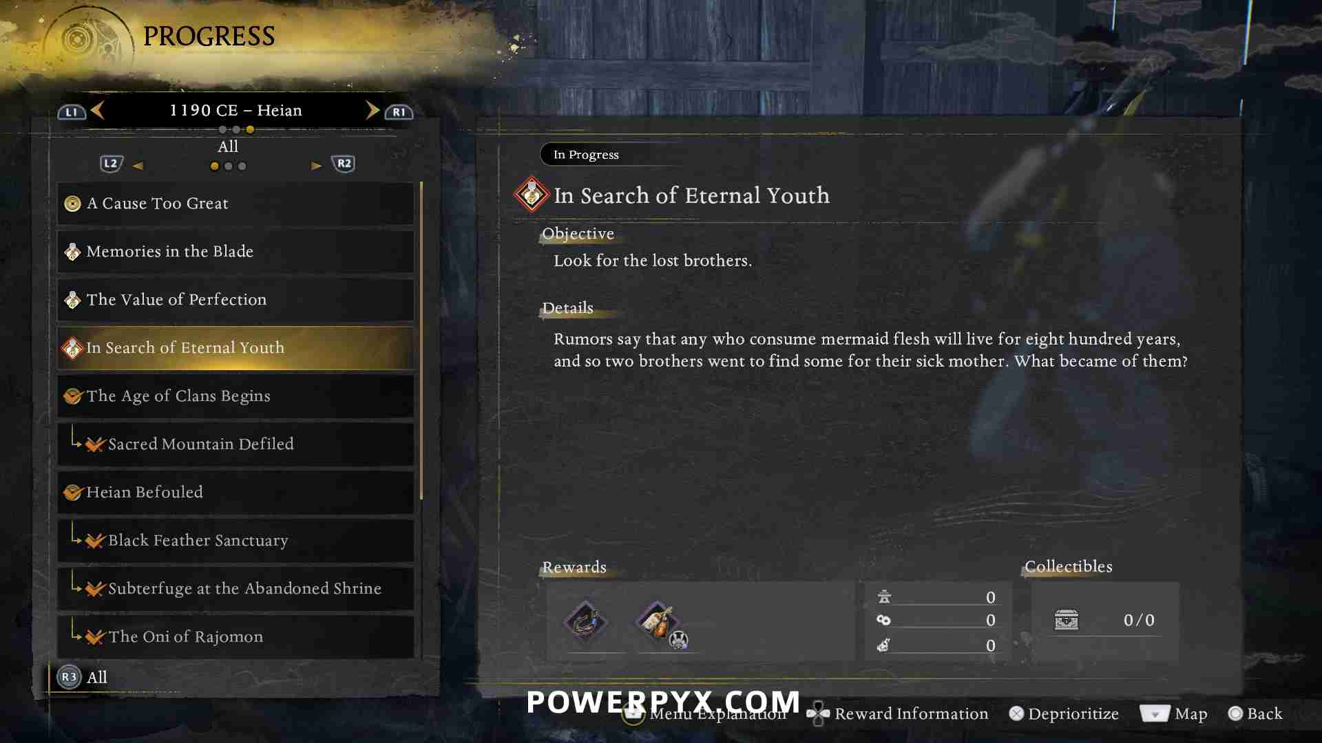After reaching Main Region 2: Heian, return to the Eternal Rift and speak to Matsunaga at the Teahouse. The first time you do this the Myth will automatically start. Talk to him again to continue the Myth. This Myth doesn’t have the target directly marked, you need to find a specific Tea Bowl – see The Value of Perfection Walkthrough (Tea Bowl Location).