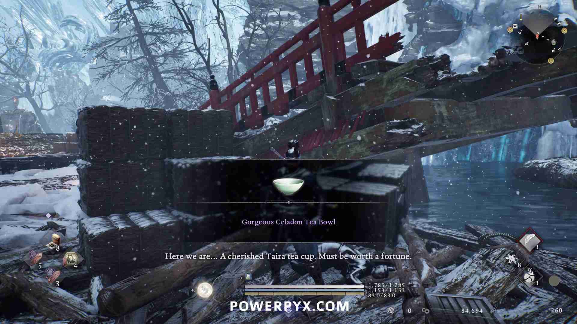 Go to Heian > Nishiichi region. At the east exit of the area, loot the corpse next to the bridge, behind some boxes. This gives the Gorgeous Celadon Tea Bowl.