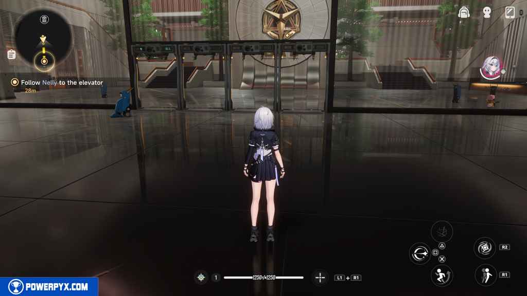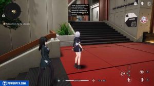 Then head up the stairs to your right. Take a left up another set of stairs and approach the girl in front of the elevator.