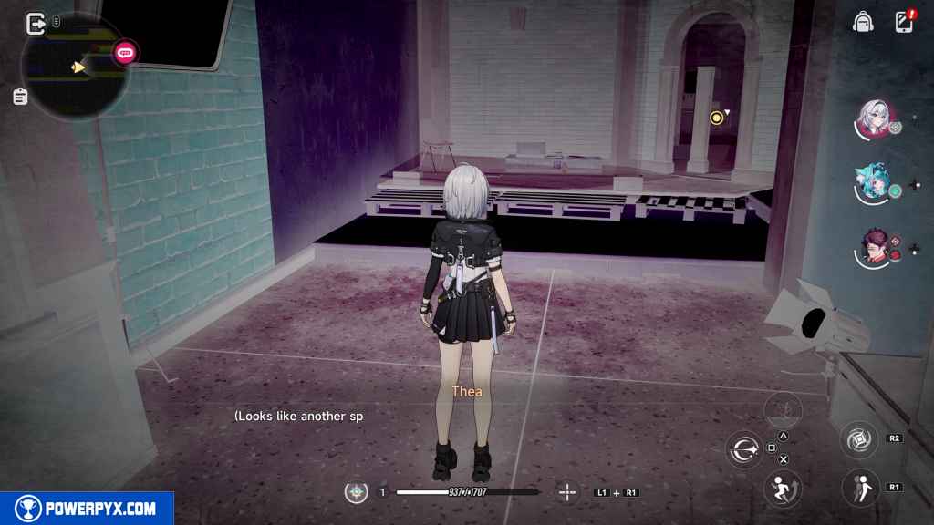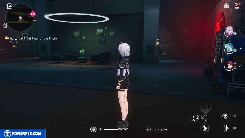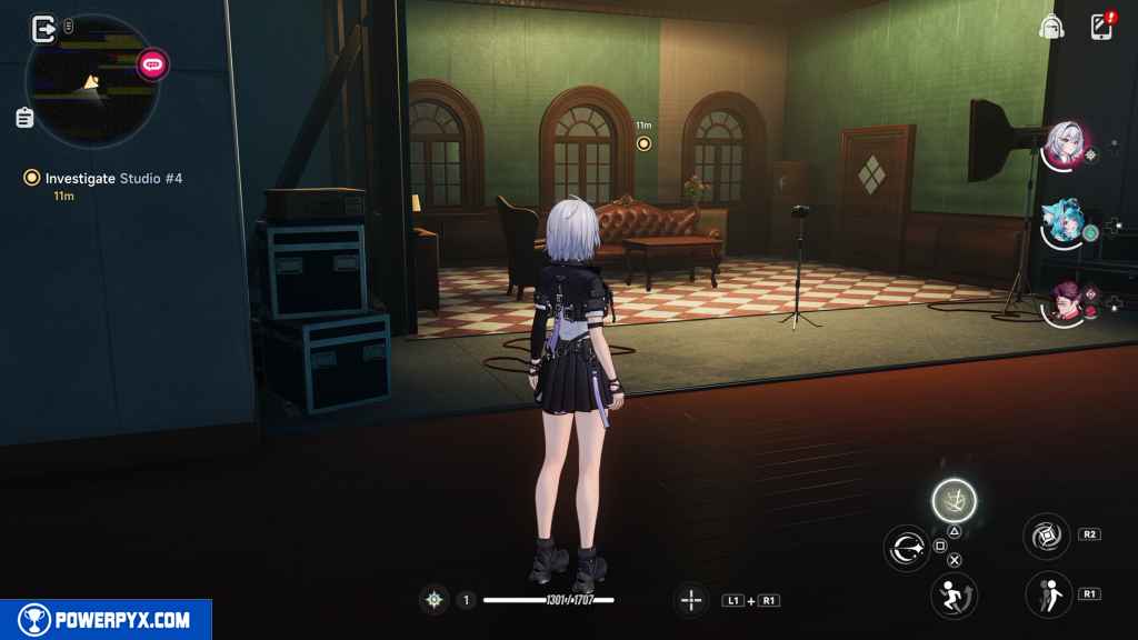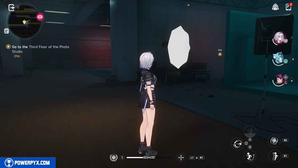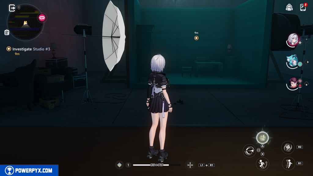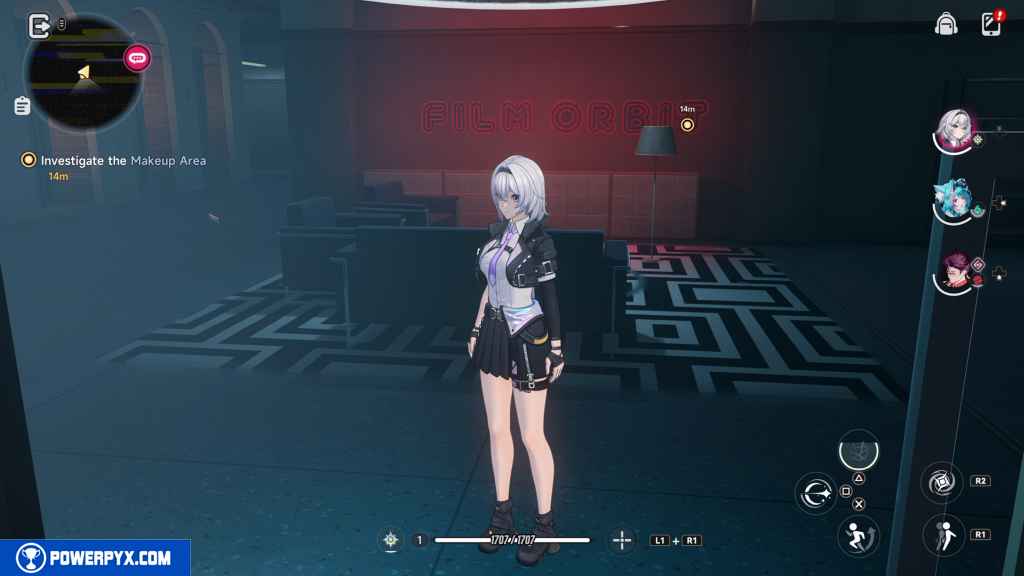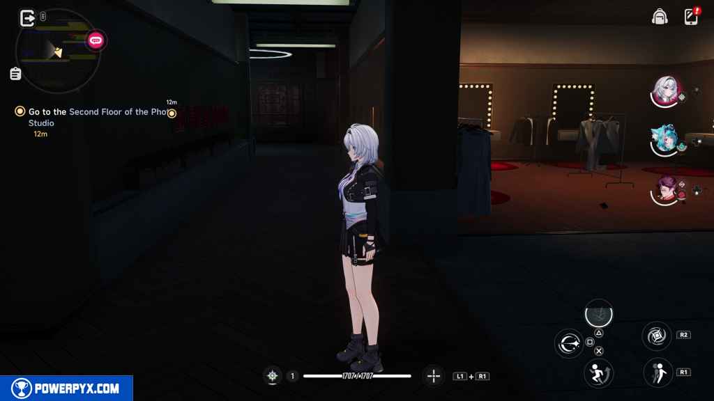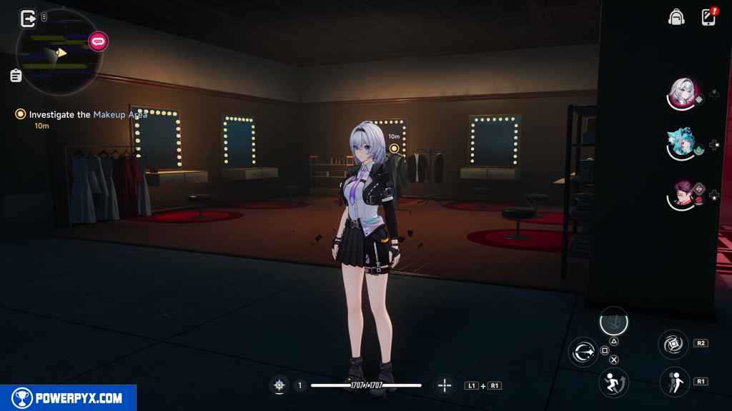 Go around the left of the wall behind you. Step into the Makeup Area to progress.