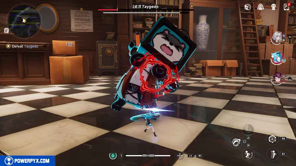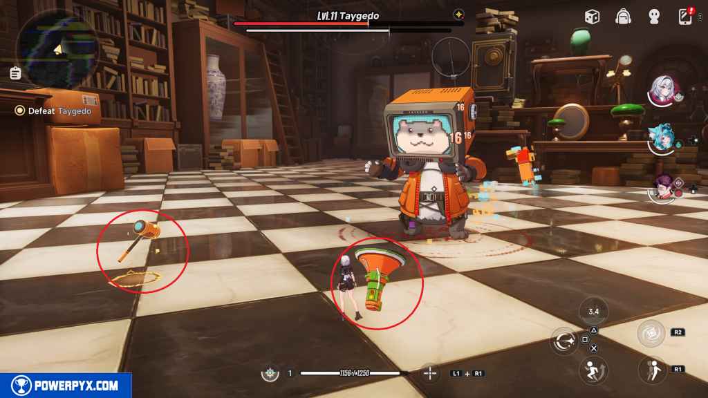 He also drops random items on the ground. Pass through them to throw them back at Taygedo and inflict damage.