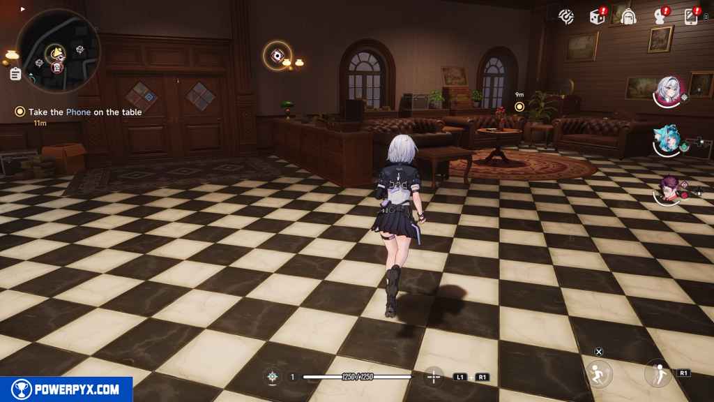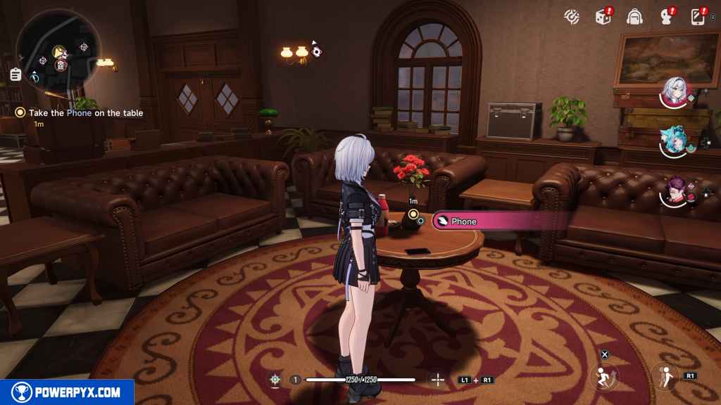 Turn around and approach the coffee table by the brown couches. Interact with the phone.