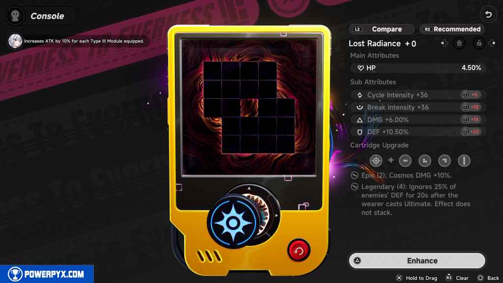 This introduces you to the Console menu. Here, you learn about Cartridges, which act as gear for your characters and grant passive stat buffs, similar to Arcs.