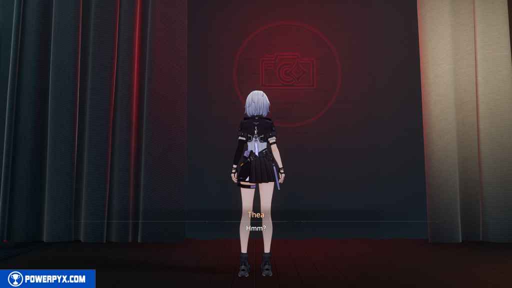 Approach the stage. After an animation, the door at the back of the stage opens. Interact with it.