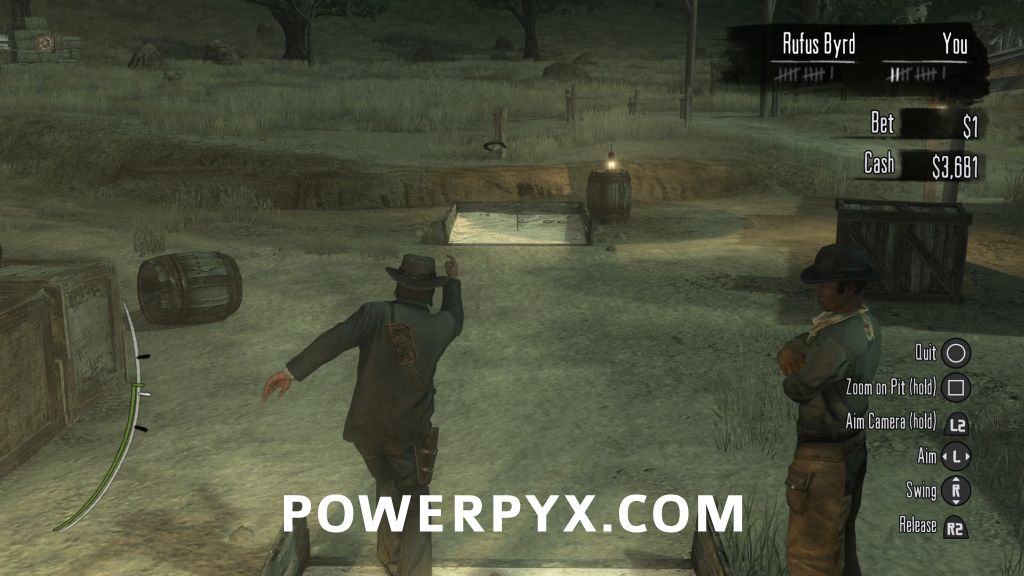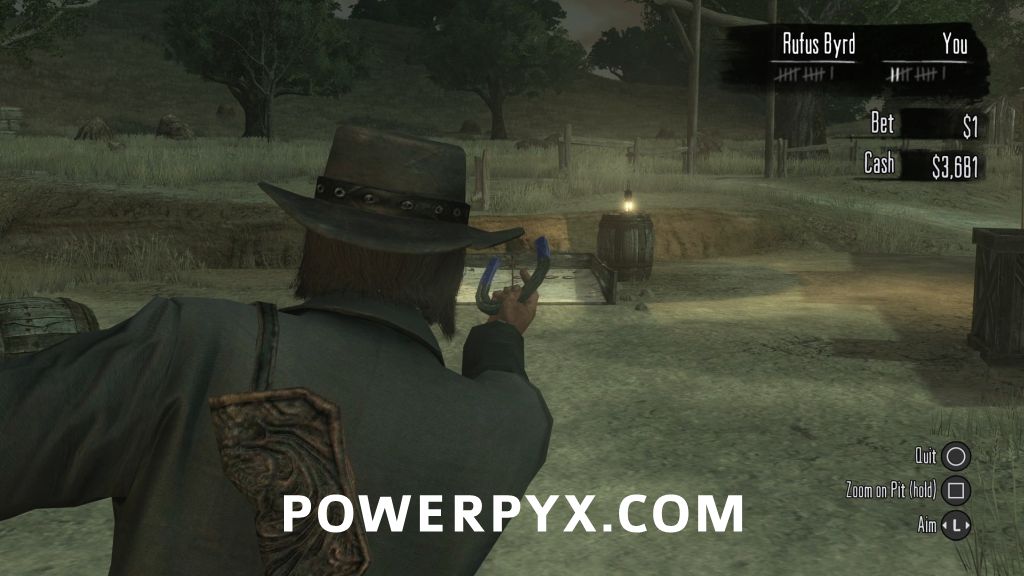 Horseshoes is one of the many minigames in Red Dead Redemption, and potentially the most irritating. Using the / button to aim, use the heels of the horseshoe and the ends of your fingers as a guide to line up on the stake as seen below.