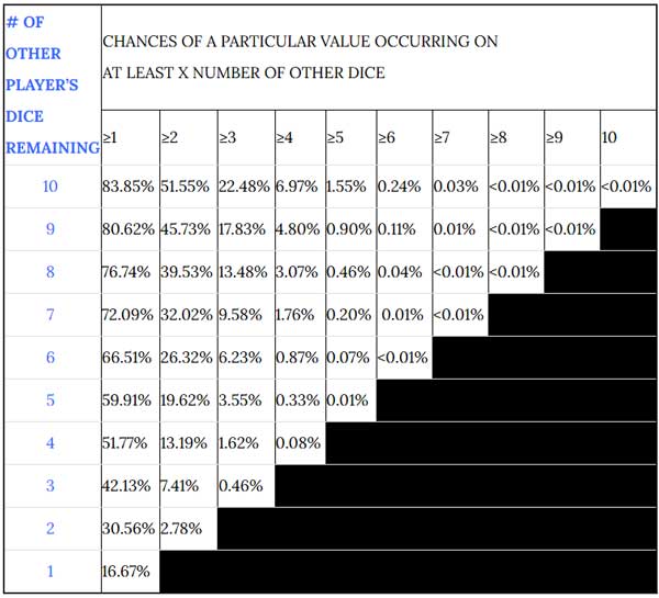 If the next player chooses to bid then the play continues to the next player in sequence, otherwise it triggers a showdown where everyone reveals their dice. If the bid was correctly called out as a bluff then the bluffing player loses a die, otherwise the player who called them out loses a die. Declaring a bid “spot-on” (which is to say exactly correct) is a riskier venture. If there are less or more dice of that value on the table, then the declaring player loses a die. But if the player declaring the bid is “spot-on” happens to be correct, then all other players lose a die (including the player that made the bid!). Strategies: