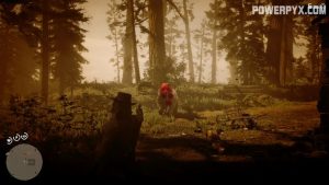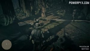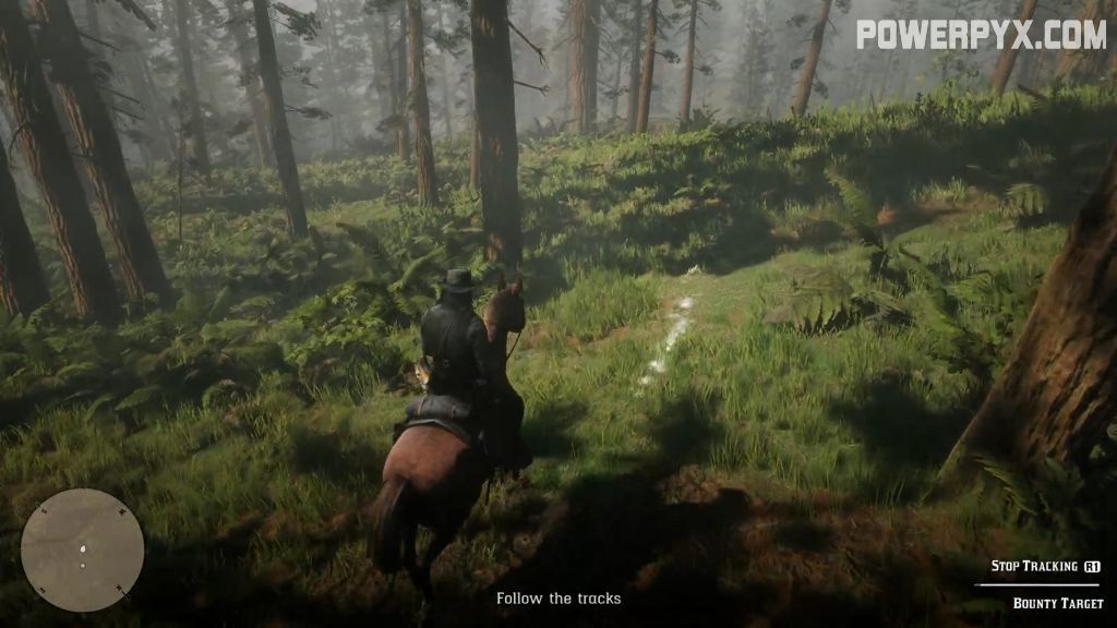 Mount your horse and follow Sadie to Tall Trees. She’ll stop at a destroyed camp. Use Eagle Eye to track the trail of the bounty target, and get back on your horse.