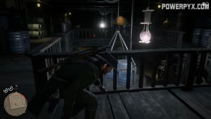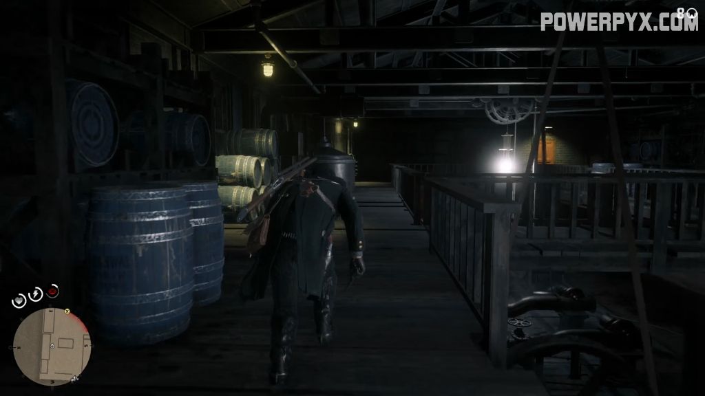 On the second floor, you’ll be on a wooden catwalk. There will be a guard leaning on the railing facing North.