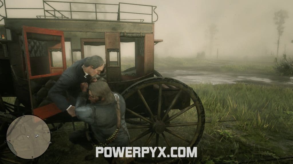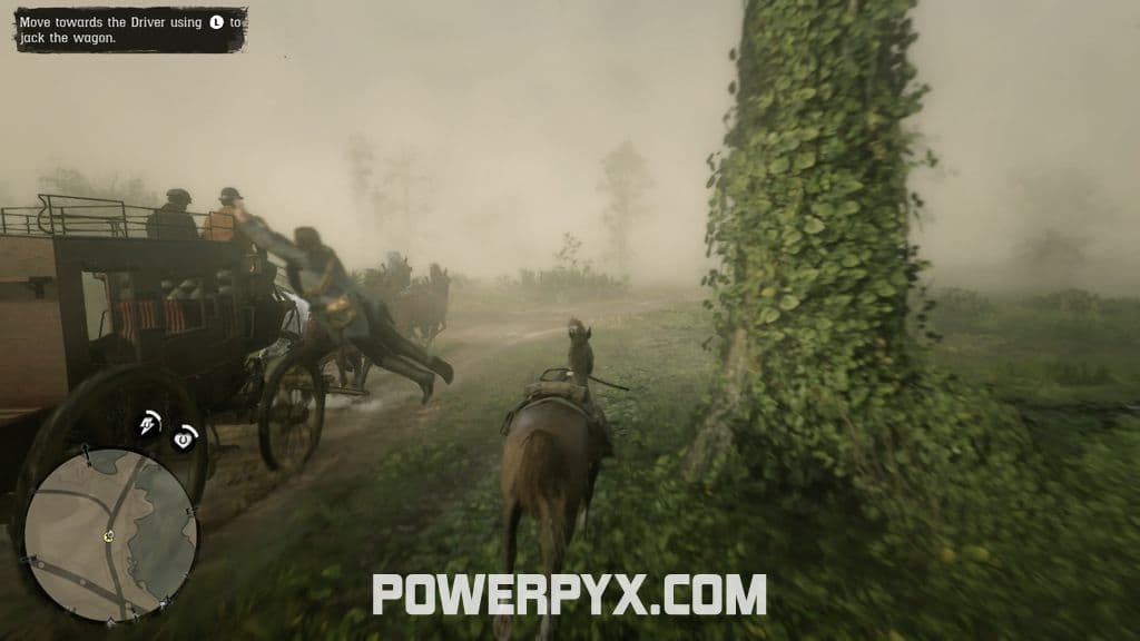 After jumping on the nearest horse, ride as fast as possible after the carriage. After heading over the bridge leading out of Saint Denis, the carriage will take a right turn – this is the first opportunity to come close enough to jump