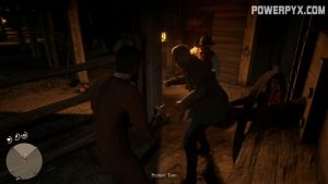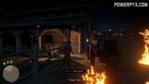 Talk with David Geddes briefly before going home. After you turn in for the night, you’re woken up by more gunfire. Running out in your long underwear, you find that the ranch is on fire and Tom Dickens is being assaulted by two Laramie boys. Follow the waypoint to find him by the stalls.