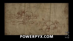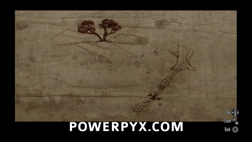 Follow the path shown in the second part, to find a group of three trees with the rocks between them.