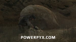 Directly behind Hanging are two slightly smaller rocks. Go between them and look for a conspicuously stacked group of rocks right in the corner, against Hanging Rock.