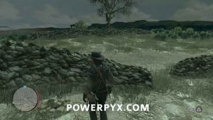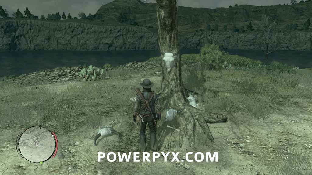The tree with the cow skulls is north of Chuparosa in Rio del Toro. From the tree, head north towards the river and around the wall on the other side of the road.