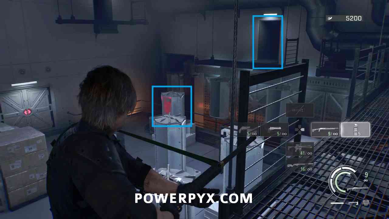 Run back to the save room if you need, then progress to the Stockroom. This area initially has another 4 enemies you want to deal with. They will be crouching behind cover and pop out to shoot you, and you can get them with sniper rifle headshots if you are quick enough. If one runs over to the left and you can’t see them anymore, you can go to the right and climb up onto the catwalk, then aim down into the next area to take out any remaining enemies before jumping down.