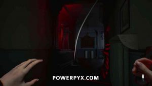 Leave the room and follow the hallway to the right. When you reach the spot with the red light, interact with the light switch on the wall to turn on the light at the end of the far hallway. This section you won’t be able to move into the rooms with no light, so you need to turn this on to progress. Once you turn the light on you can walk all the way to the end of the hallway.