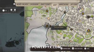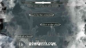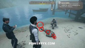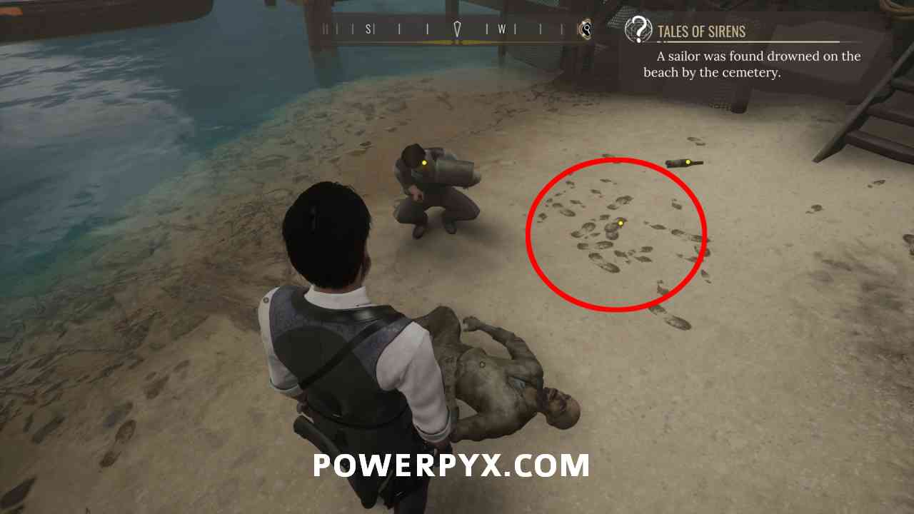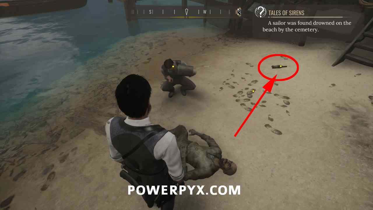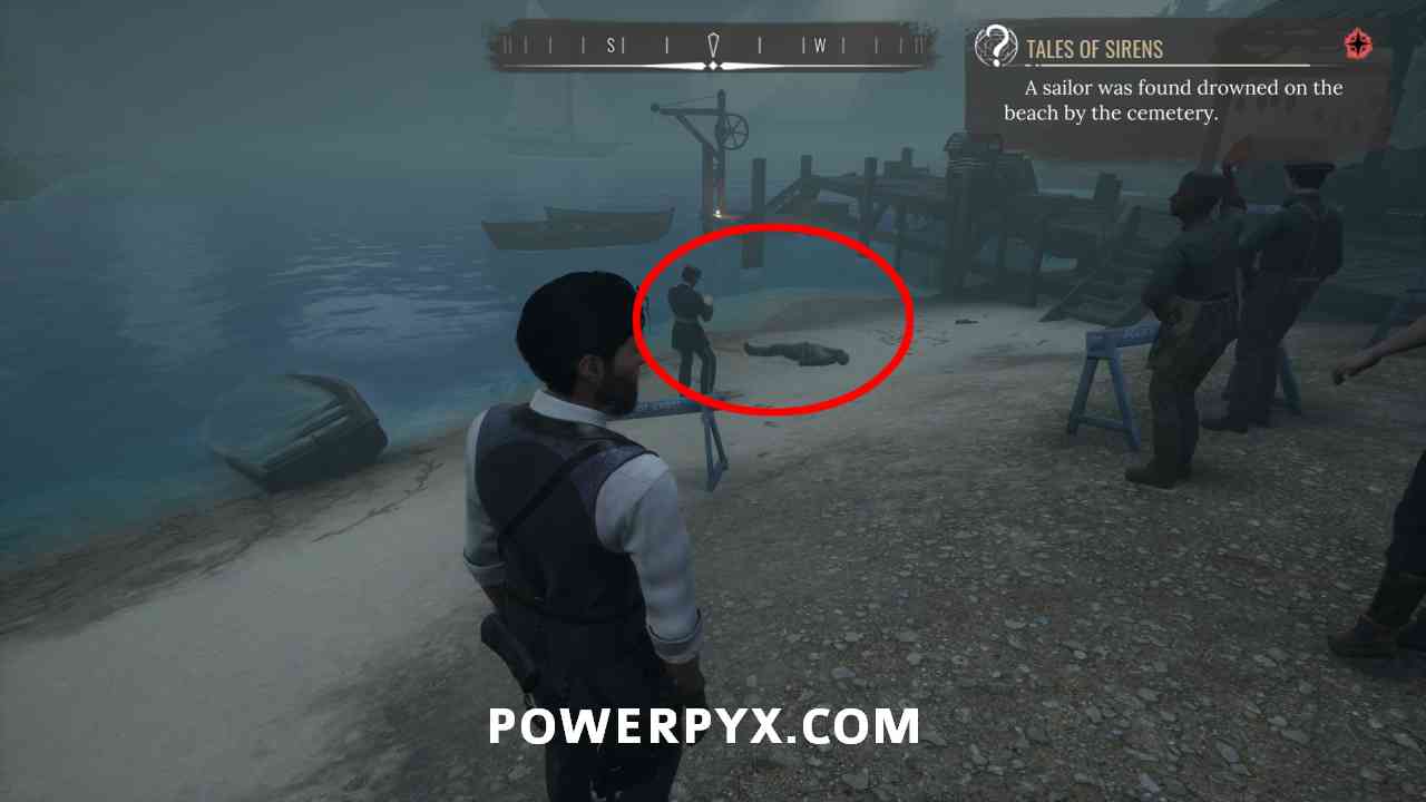 1) Pin the “Tales of Sirens” objective in the casebook. Our first task is to head to the beach south of the Cordona Cemetery. It’s at the Greek bridge between Miner’s End and Grand Saray. There you will find a policeman and the sailor’s corpse.