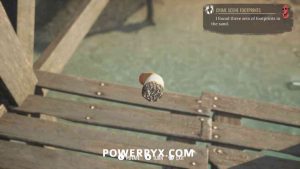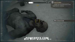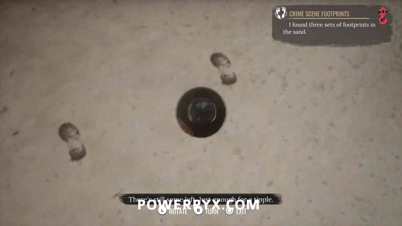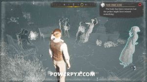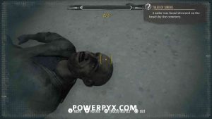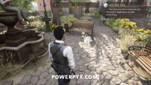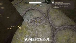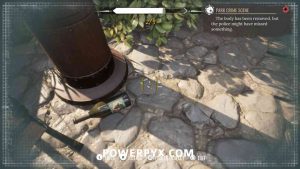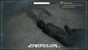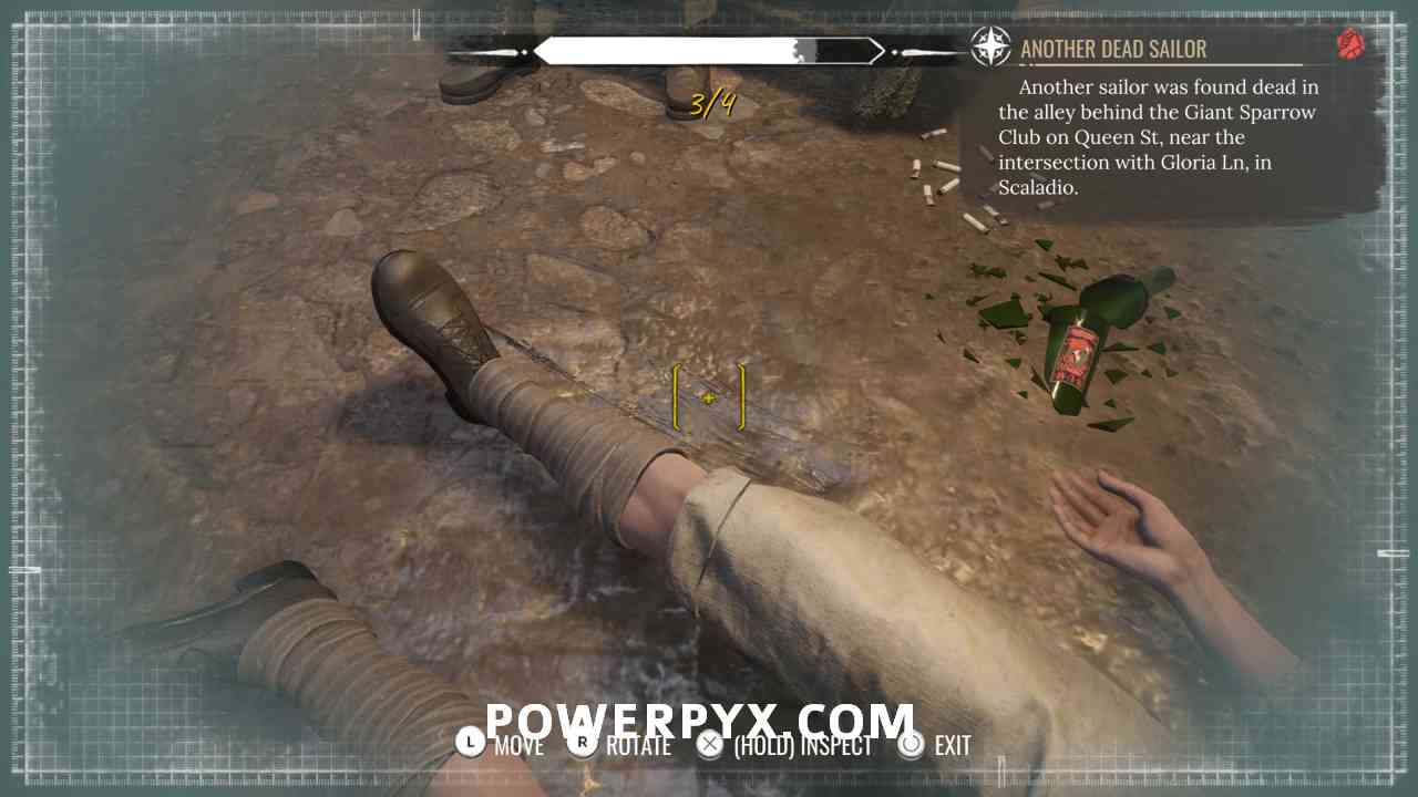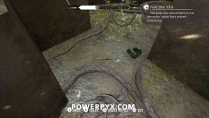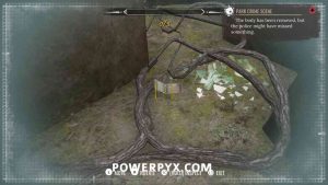 2) Upon approaching, Sherlock will automatically enter a conversation with the policeman. Exhaust all dialogues to get info from him. Now it’s time to inspect the crime scene. First up, view the drag marks between the corpse and the water. Then inspect the corpse itself, it has 4 clues (kiss on forehead, mouth, left hand, left boot – move left stick to reach it).
