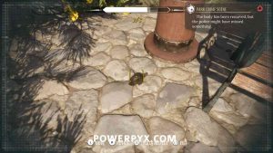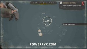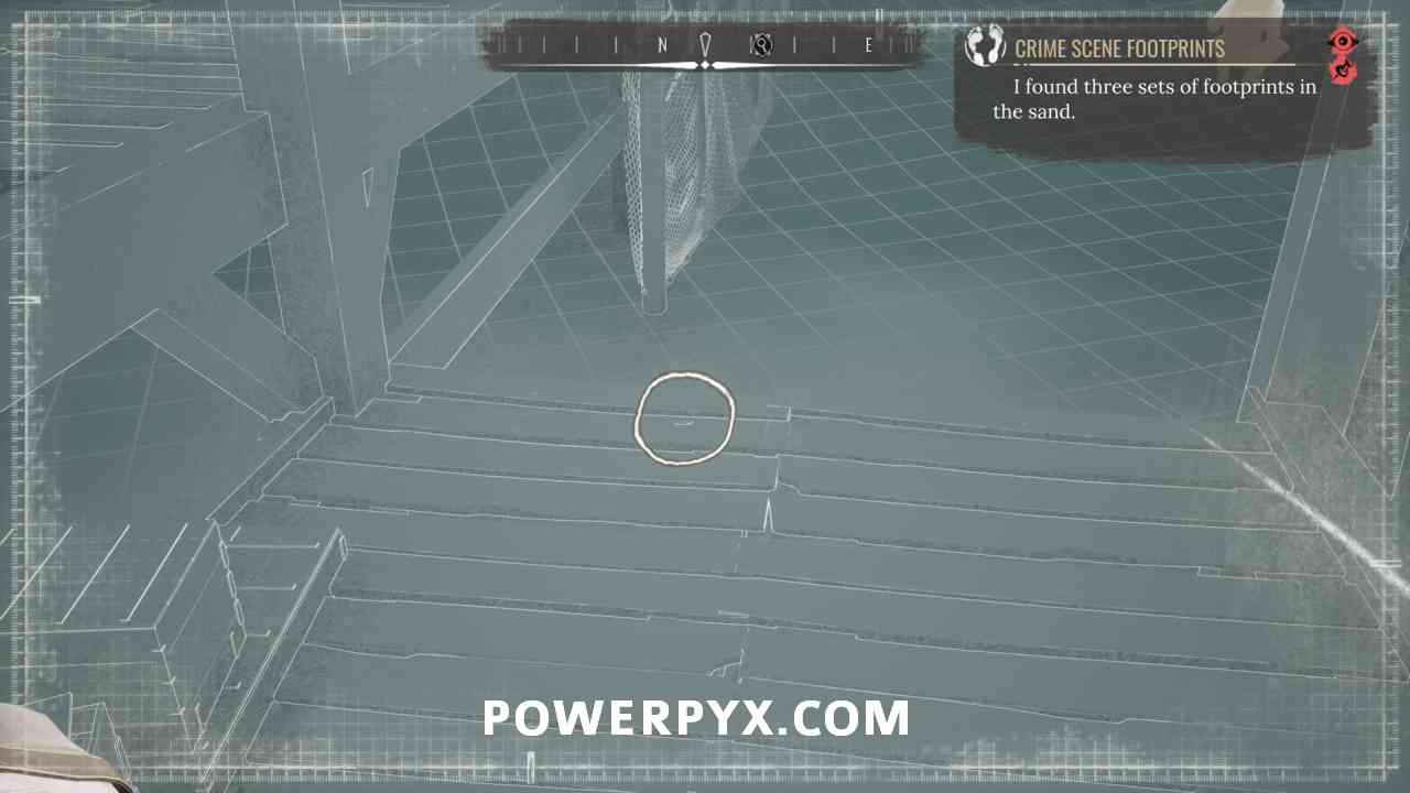 5) Inspect the footprints next to the corpse. Then pin the “Crime Scene Footprints” objective so that you can use concentration mode